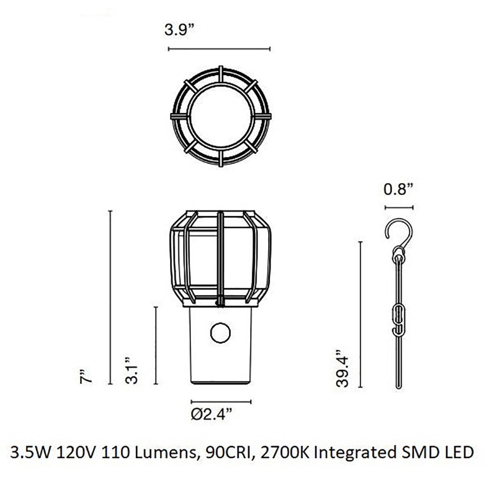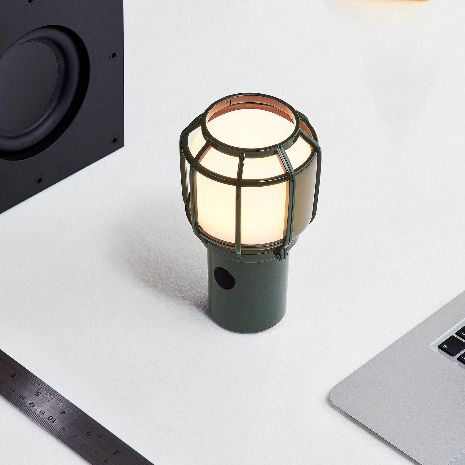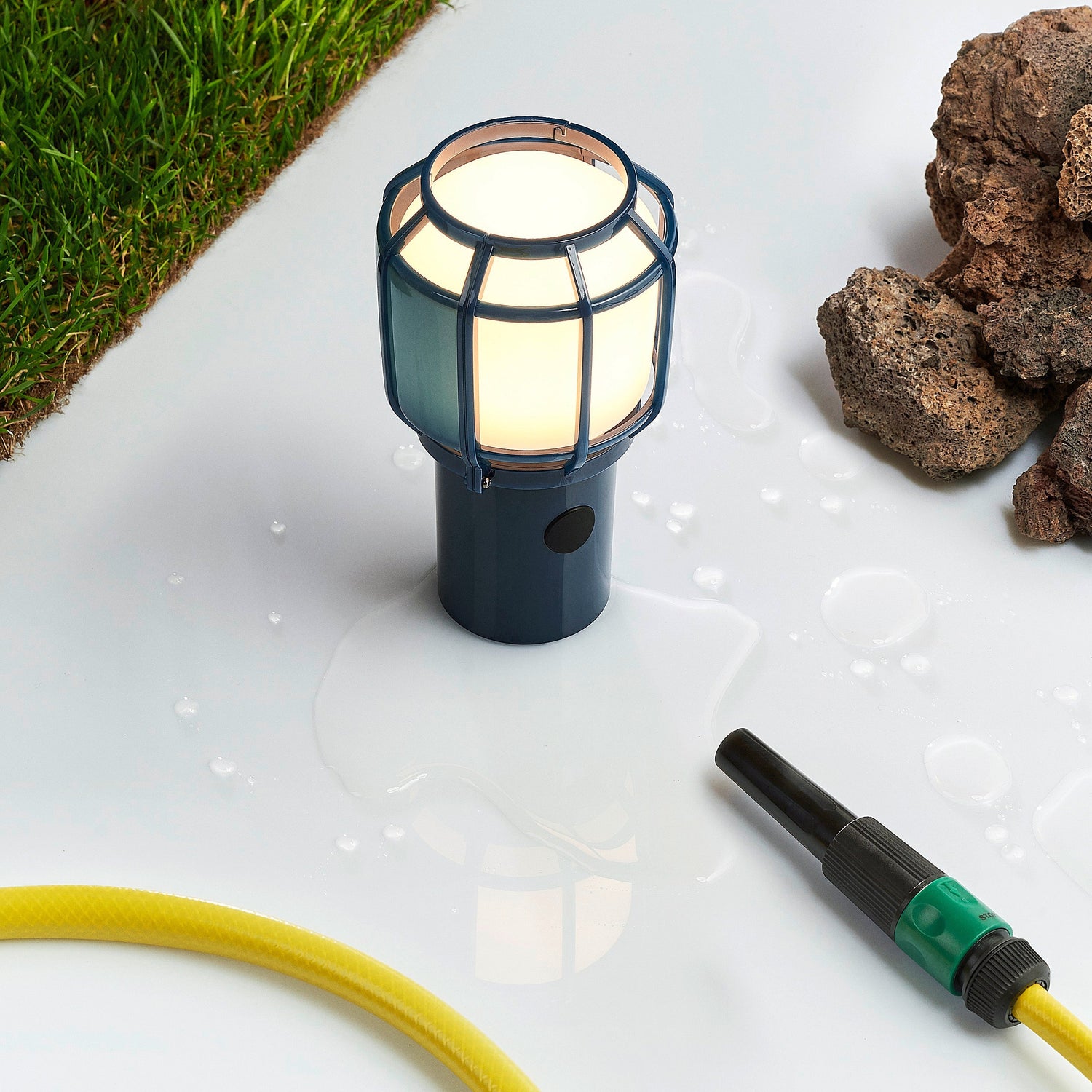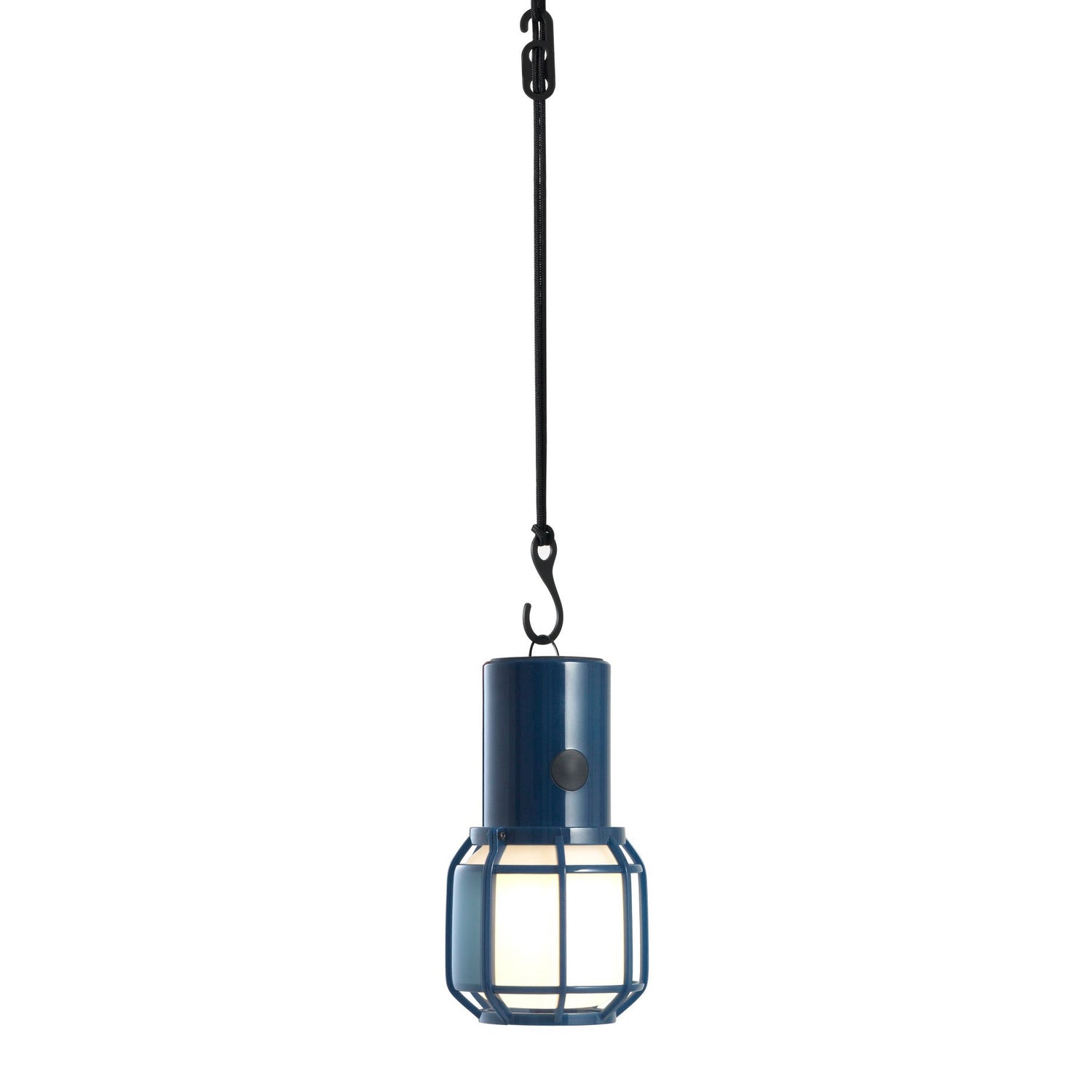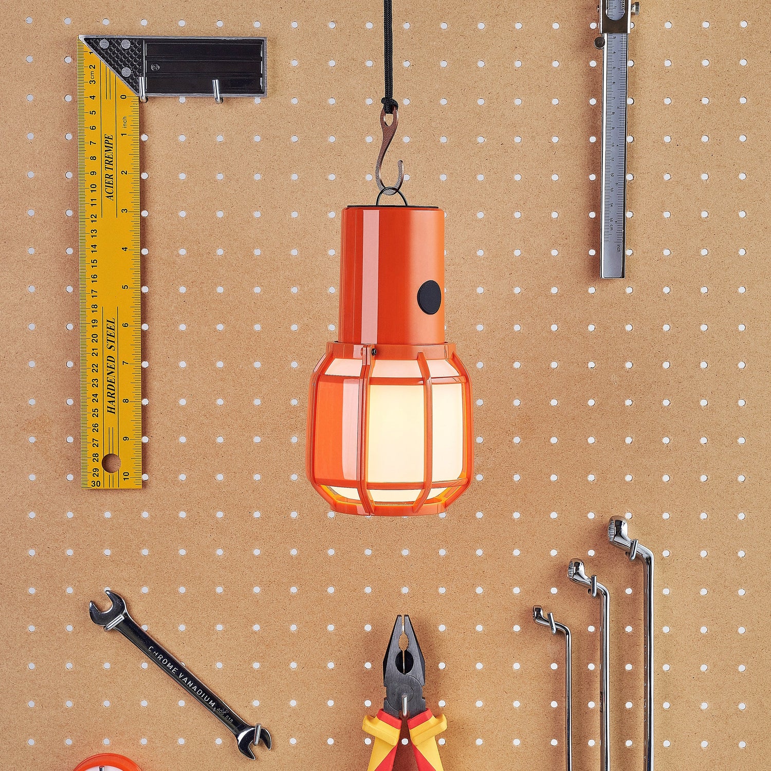 Its design evokes a garage lamp, but a high quality one, lighter and eminently useful, with three setting for illumination. It is sophisticated and conveys a warm light, decidedly designed to serve as an accompaniment. Its structure is protected by a grate that revolves the light source, a touch rendering it truly original. It also comes with an accessory that allows one to hang it.