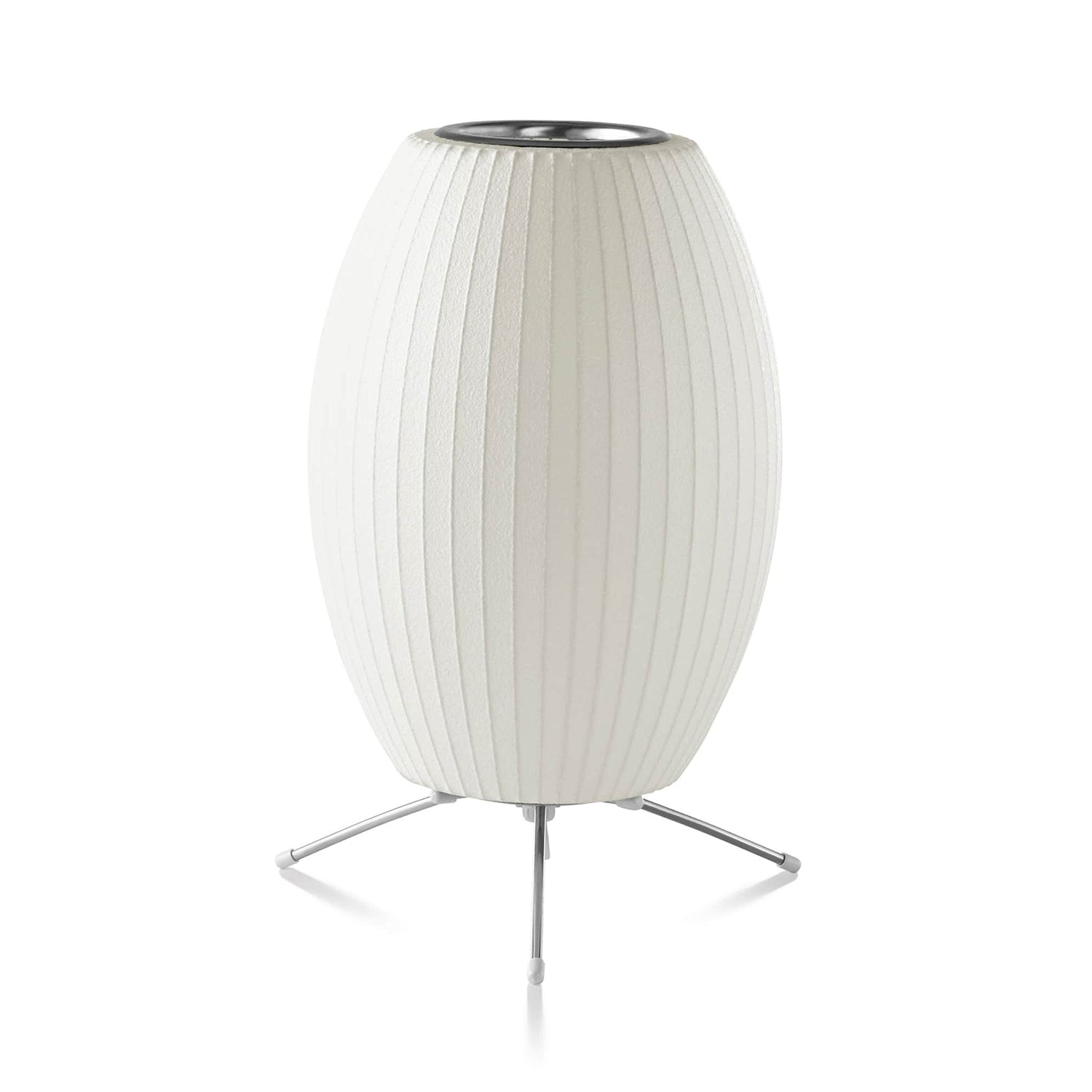 Part of the Nelson Bubble Lamp series, the Nelson Cigar Tripod Lamp has a rounded shape with clean parallel lines accentuating its elongated sphere. Set on a steel tripod, it disperses a soft light within any space. George Nelson, inspired by a set of silkcovered Swedish hanging lamps, designed the series in 1952.
