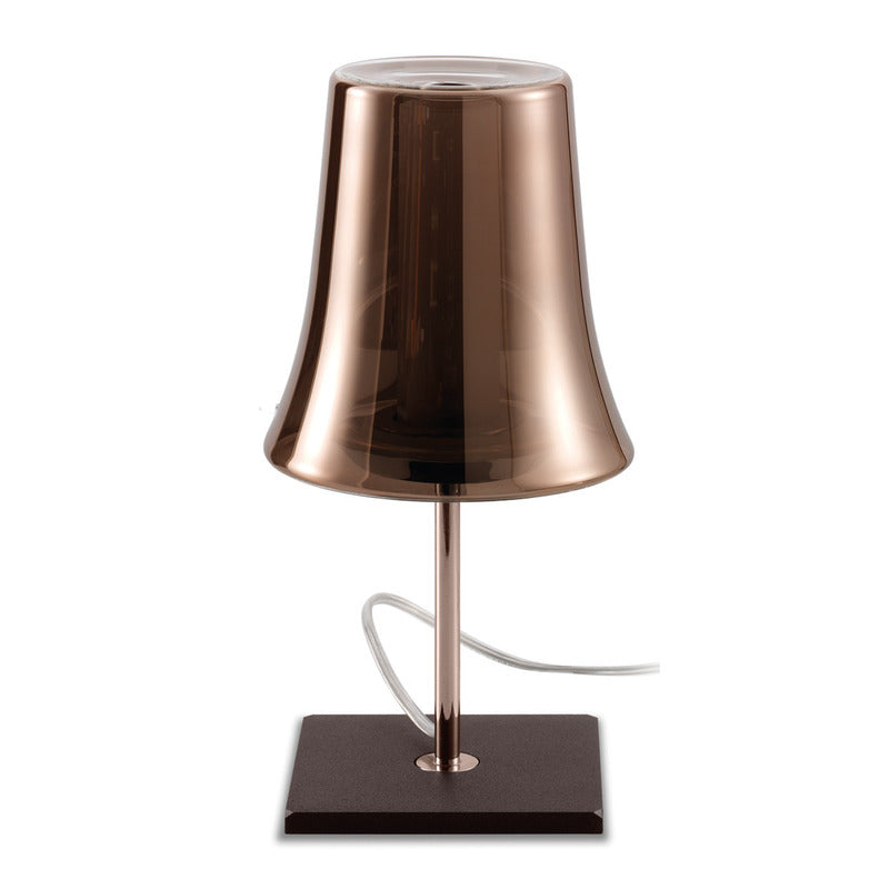 This simple and charming table lamp is part of the Cloche Collection. Composed of clear glass with a shiny copper or chrome coating and inner frosted glass cylinder. The clear glass combined with either of the exterior finishes creates a two-tone effect noticeable when the light is turned on. The stem is secured to a square rust or anthracite painted base.
