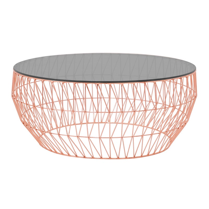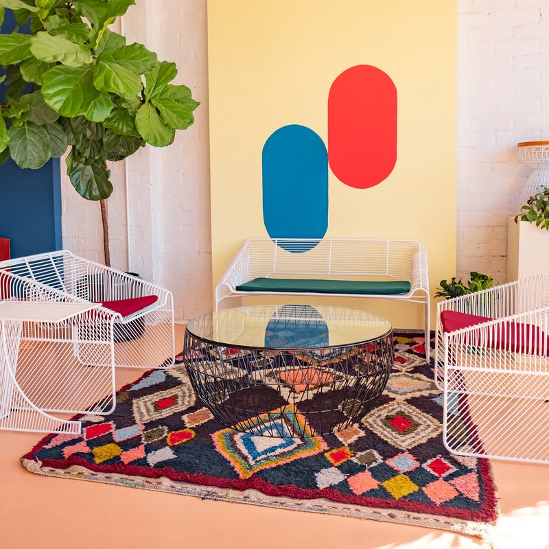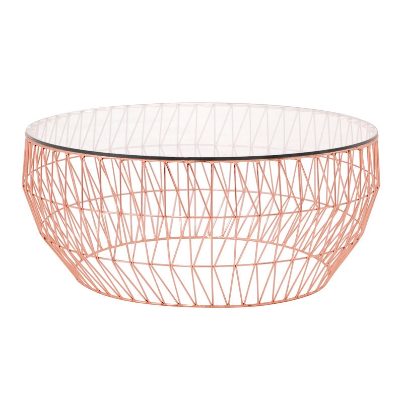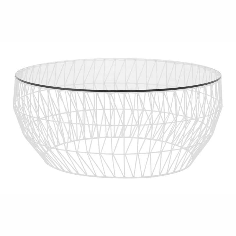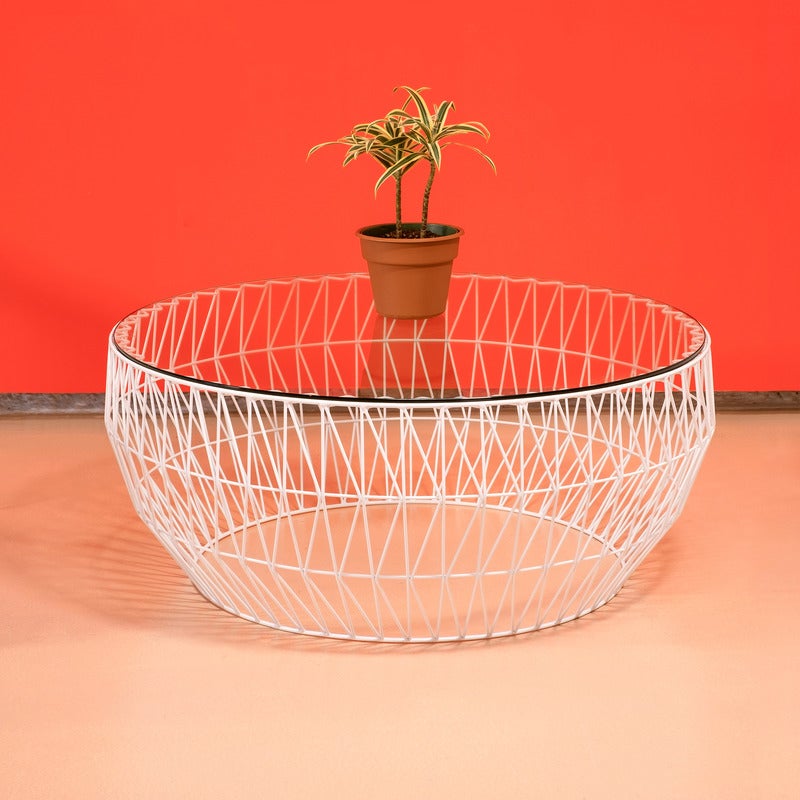 The Bend Goods Coffee Table is a generously sized modern coffee table that showcases a rounded wire base of welded steel and signature Bend Goods geometric patterning. This eye-catching contemporary table pairs the open latticework of the wire base with a solid tabletop, available in a choice of glass or marble. The Bend Goods Coffee Table, which is designed for both indoor and outdoor use, comes in a range of colors and metallic finishes, easily suited to a variety of interior design schemes.