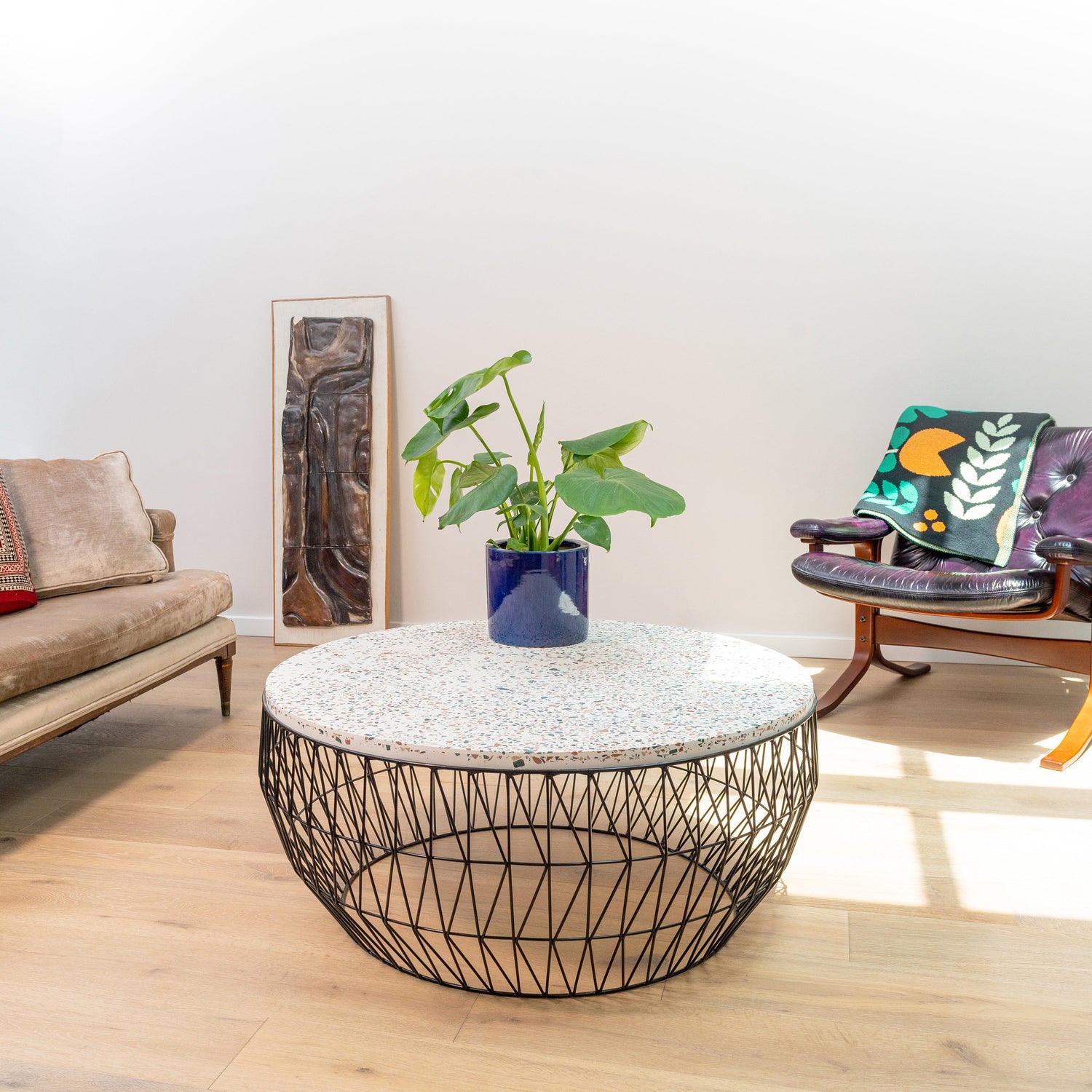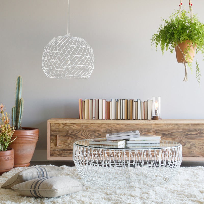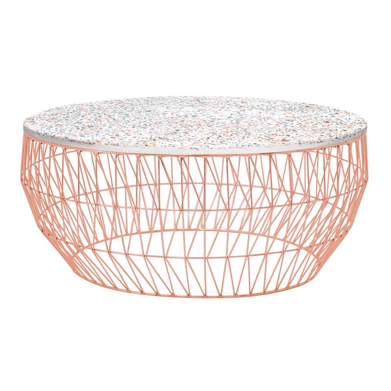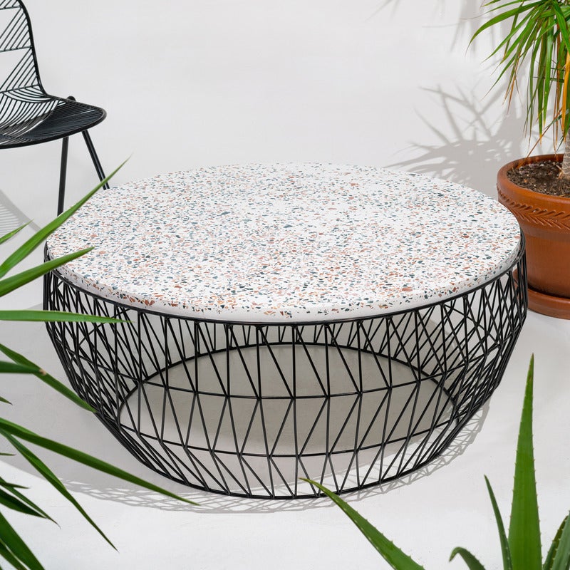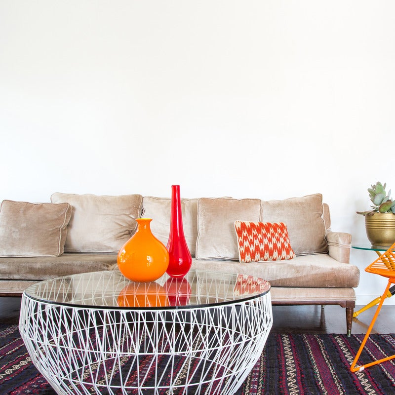 The Bend Goods Coffee Table is a generously sized modern coffee table that showcases a rounded wire base of welded steel and signature Bend Goods geometric patterning. This eye-catching contemporary table pairs the open latticework of the wire base with a solid tabletop, available in a choice of glass or marble. The Bend Goods Coffee Table, which is designed for both indoor and outdoor use, comes in a range of colors and metallic finishes, easily suited to a variety of interior design schemes.