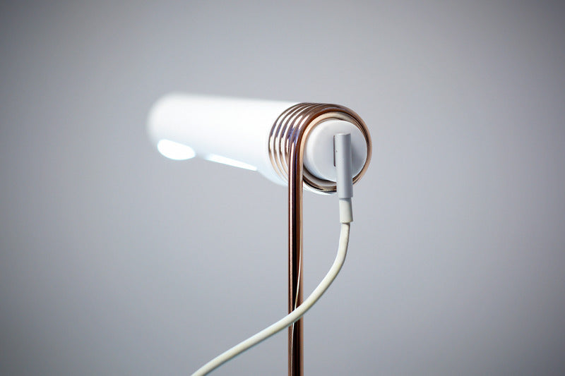 The Coil Lamp, a lightweight task lamp that draws power from either of Apple's first generation MagSafe adapters, is constructed from aluminum and copper-plated components. LEDs contained within the lamp's head emit a warm, directional light, which allows it to be used in either professional or domestic environments.