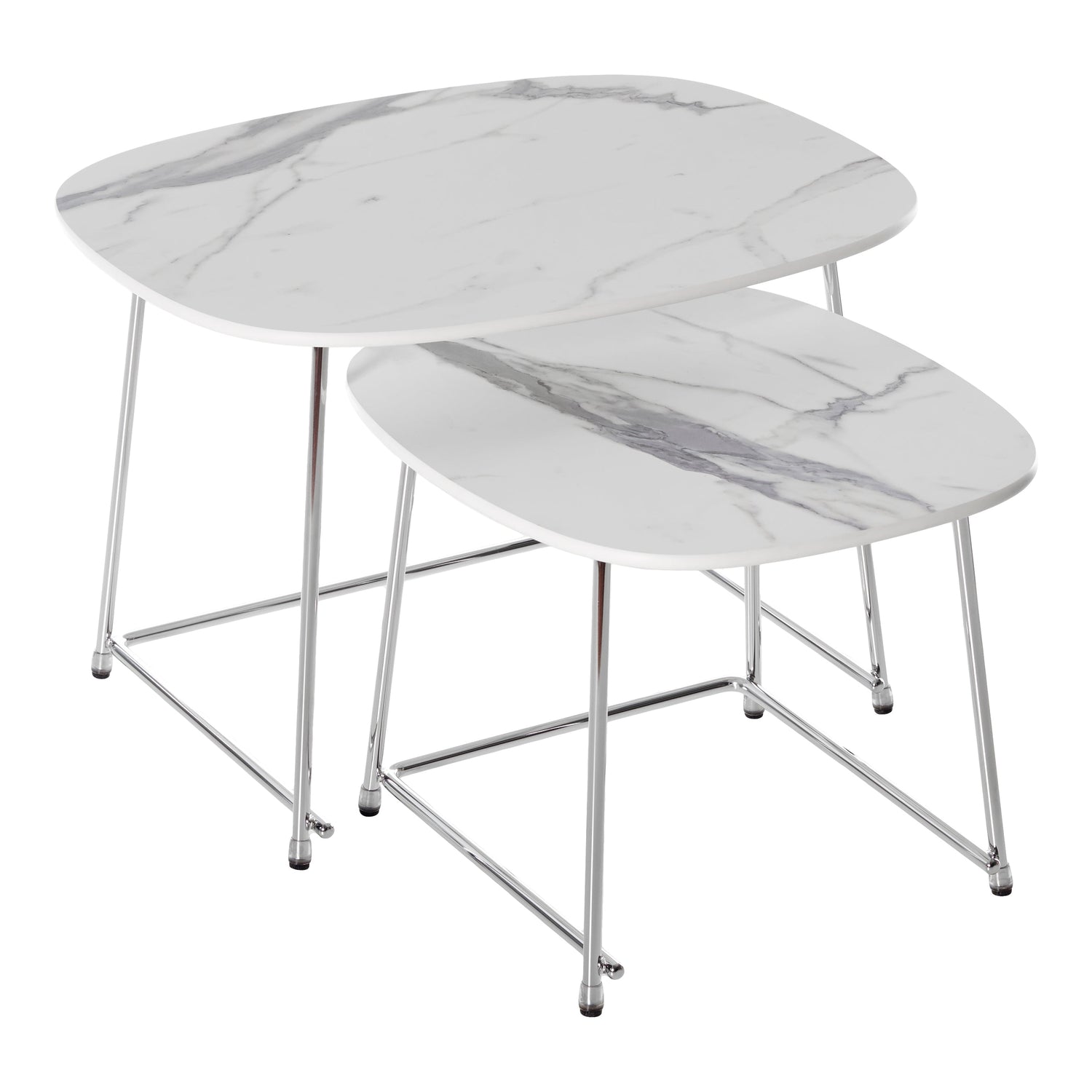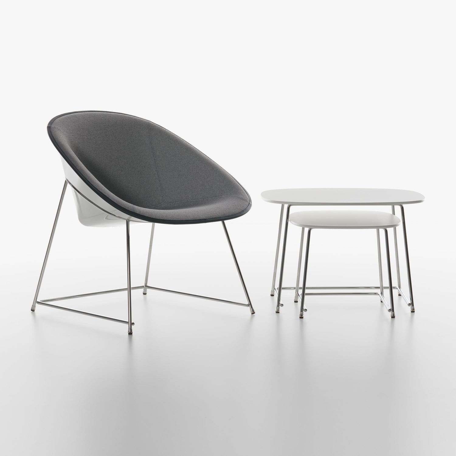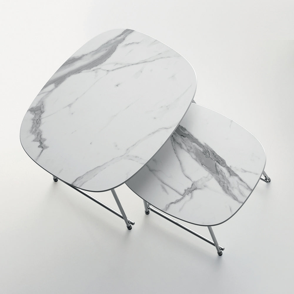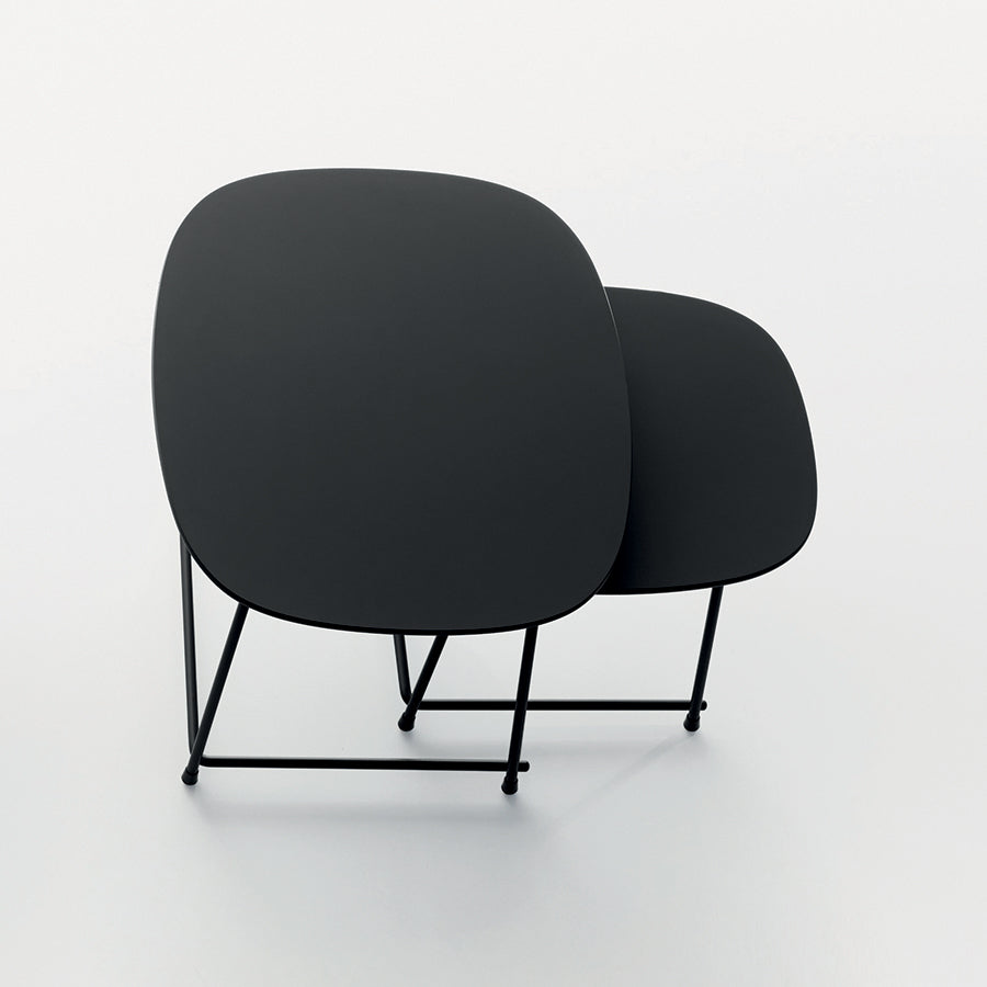 CUP lounge tables are designed with a high pressure laminate top and a powder coated metal base. Sold as a pair, the smaller table nests under the larger table. Great for side or end tables; can also be used as a coffee table.