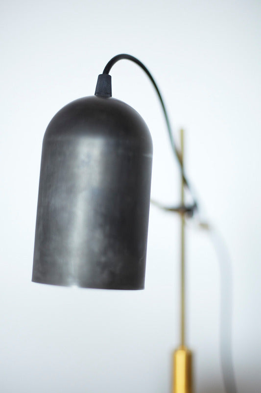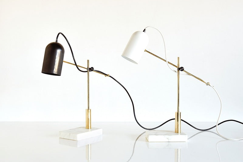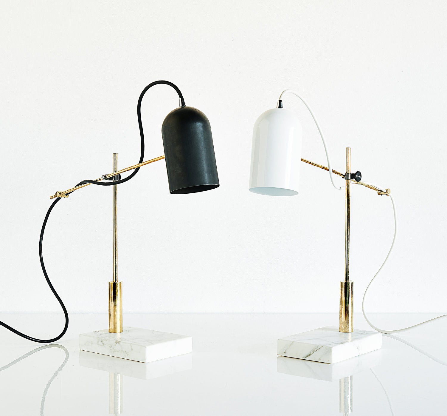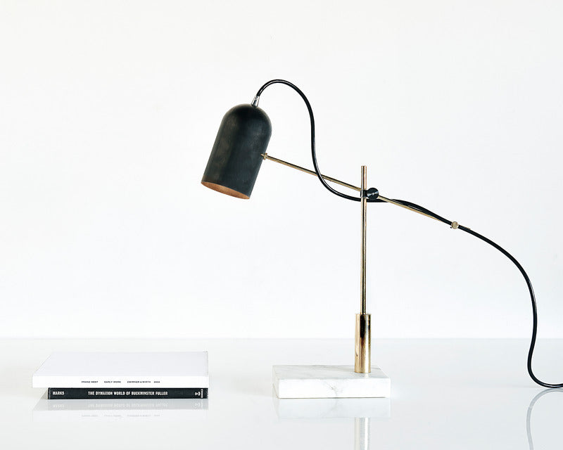 The Catherine table lamp is designed around a cylindrical shade salvaged from a defunct lighting factory. It has a base made of Carrara marble salvaged from the First Canadian Place in Toronto and has a support made of precisely machined brass.