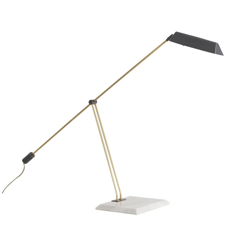 French mid-century design defines this oversized desk lamp. A long antique brass iron cantilevered arm extends from a sleek white marble base to present a contrasting bronze iron shade. Its shade is adjustable and its arm easily pivots up and down, allowing style purveyors everywhere to conquer any task. Complete with a taupe cloth cord. Finish may vary. Features an on/off rocker switch.