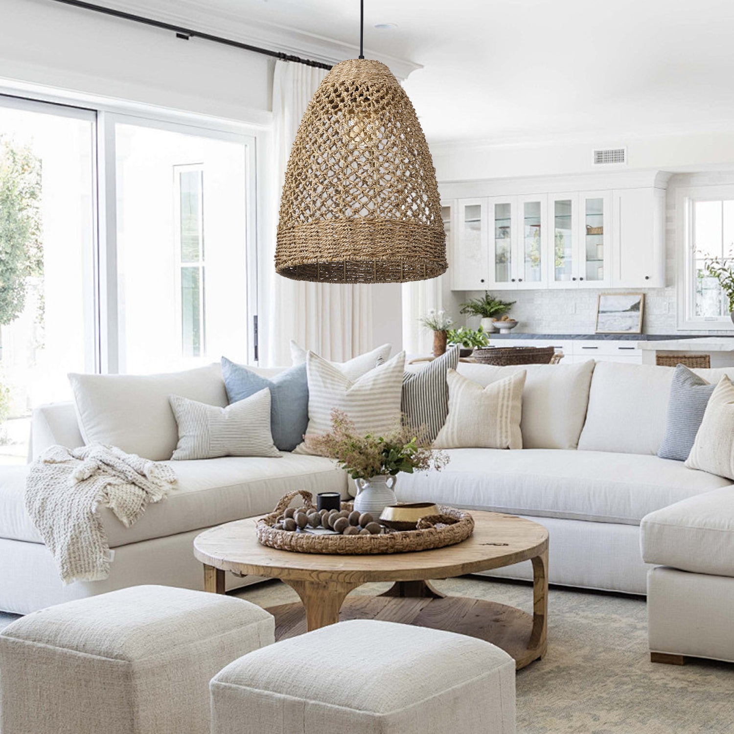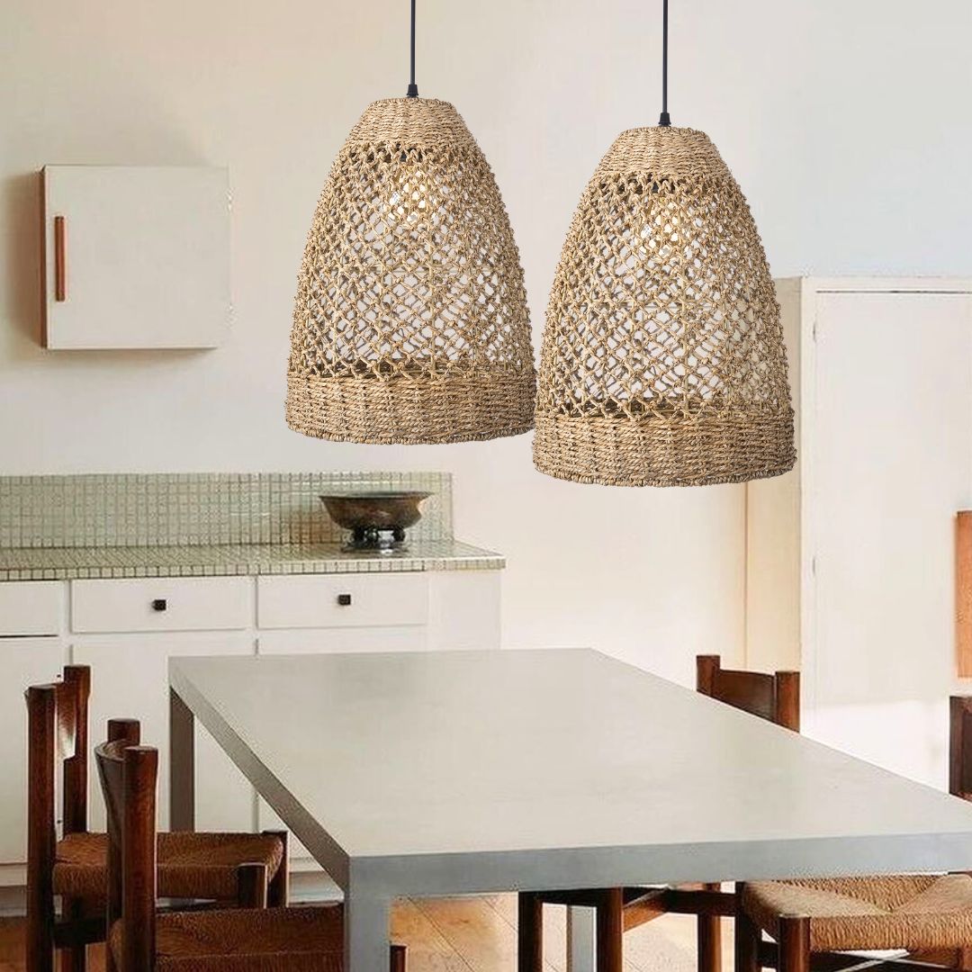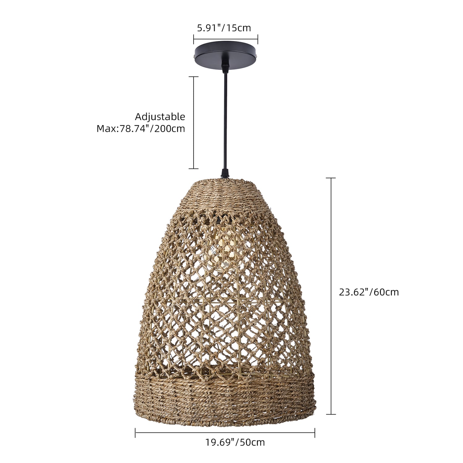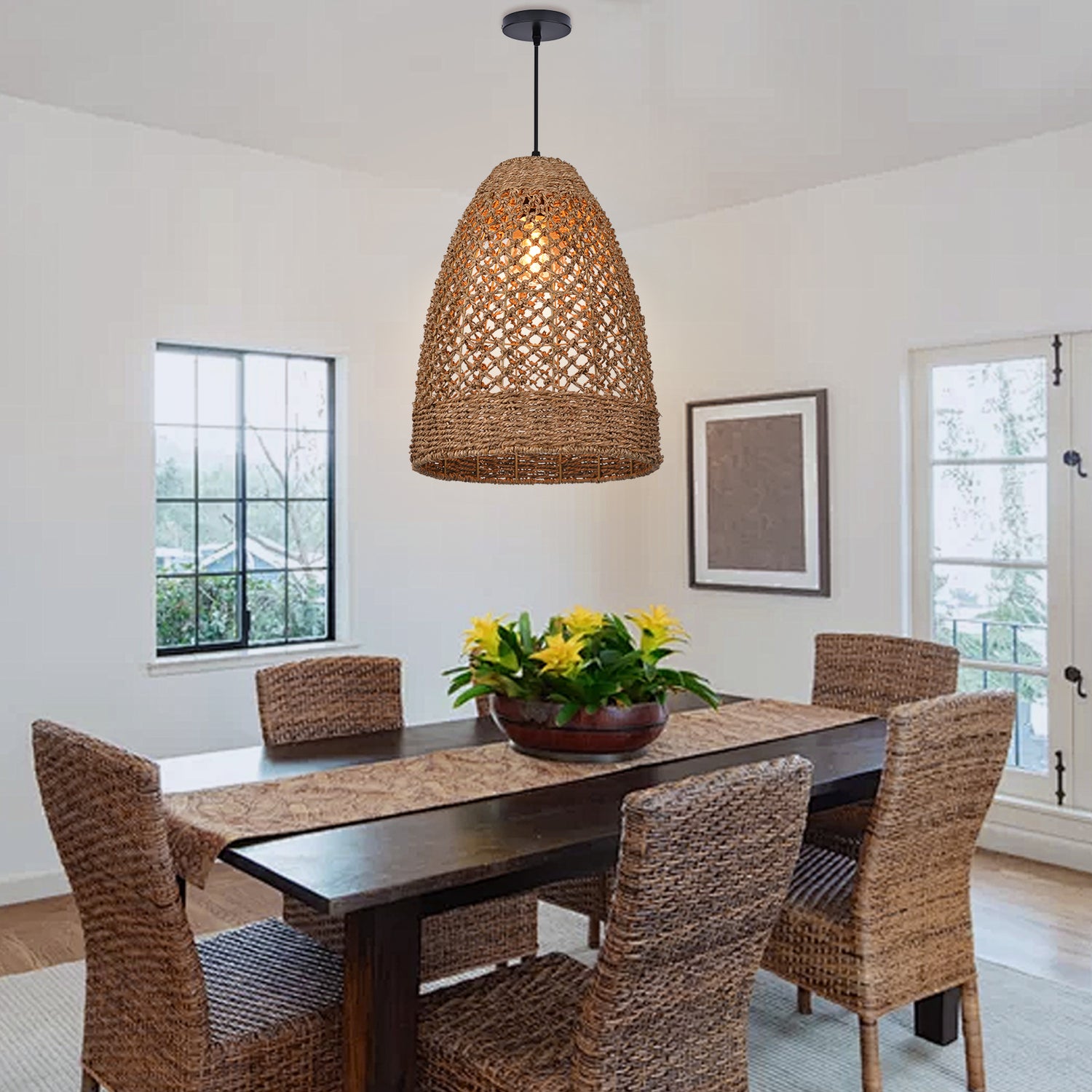 Farmhouse Coastal Boho Hanging Lamp with Handwoven Rattan Woven Pendant Light