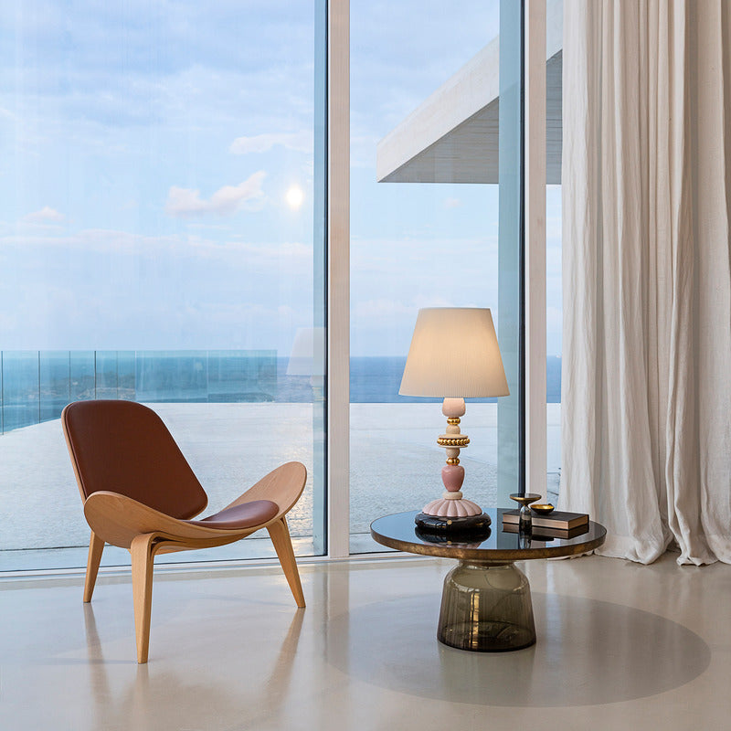 A piece of glazed porcelain, decorated in soft pastel tones with gold details and a cloth screen. The lamp is wireless, with light autonomy and a rechargeable USB system. Perfect for integration into all types of environments. Made in Spain by Lladr¨®'s expert artisans.