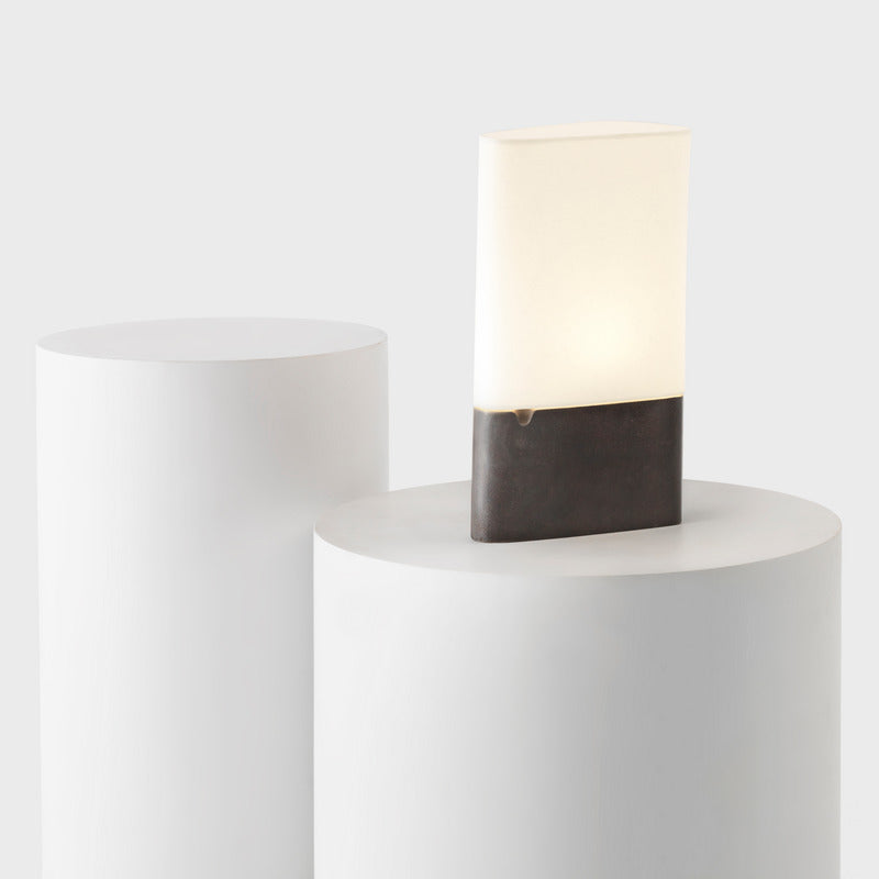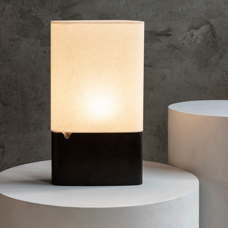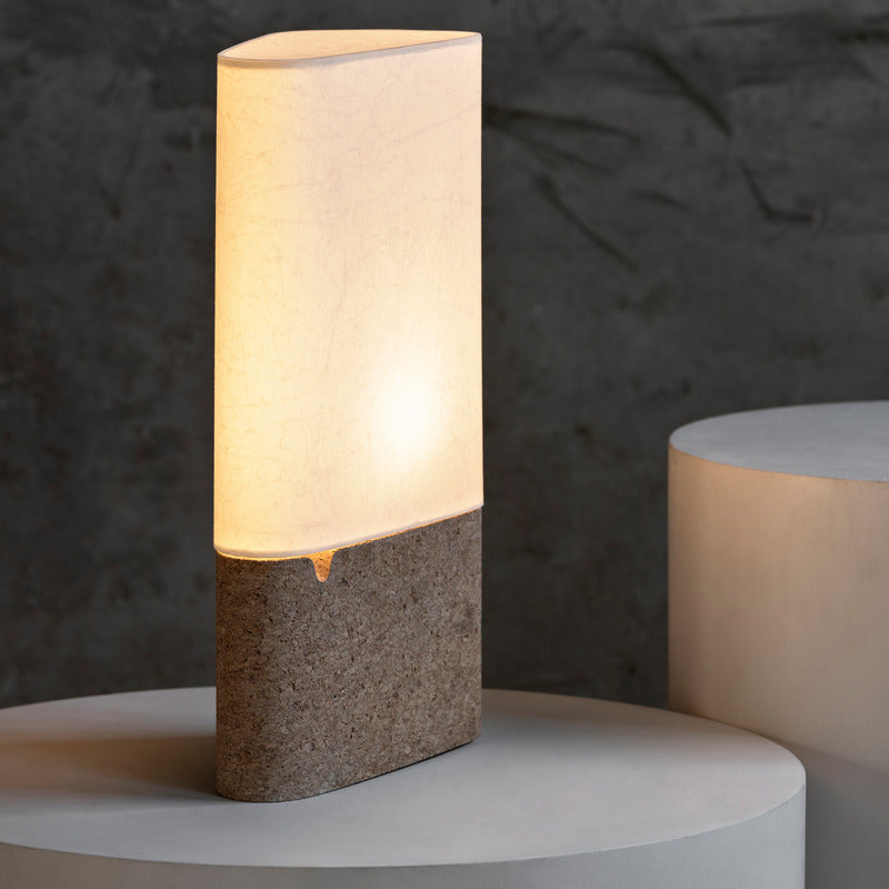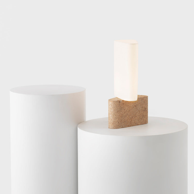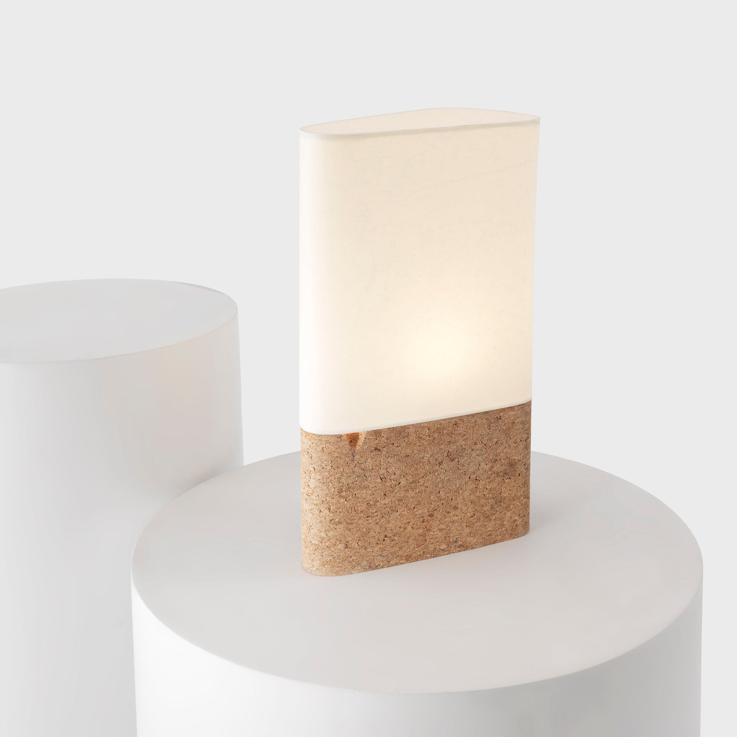 Executed with a Japanese paper shade and either a sand-cast bronze or cork base, the Fulcrum Lamp uses its classically rooted two-part format to explore a rich dialect of material and mass.
