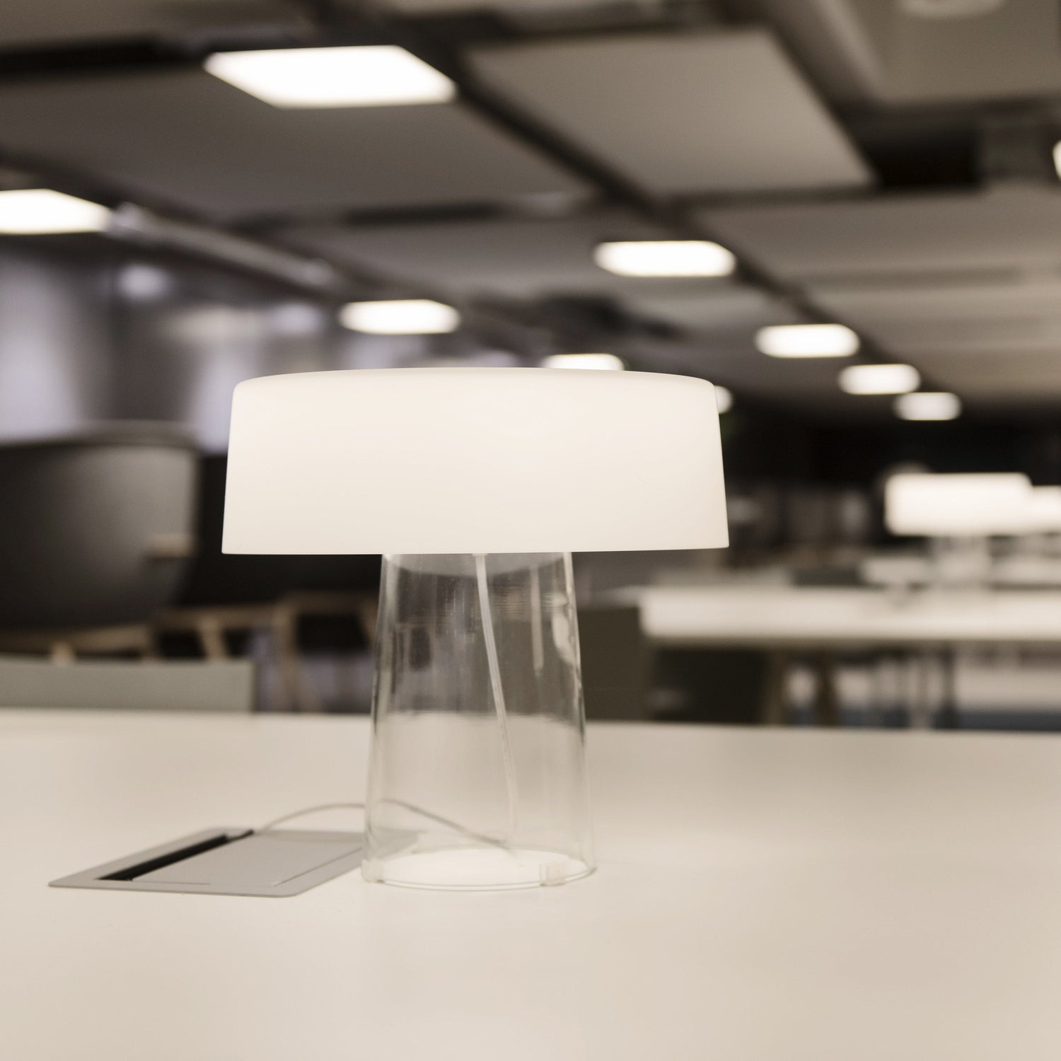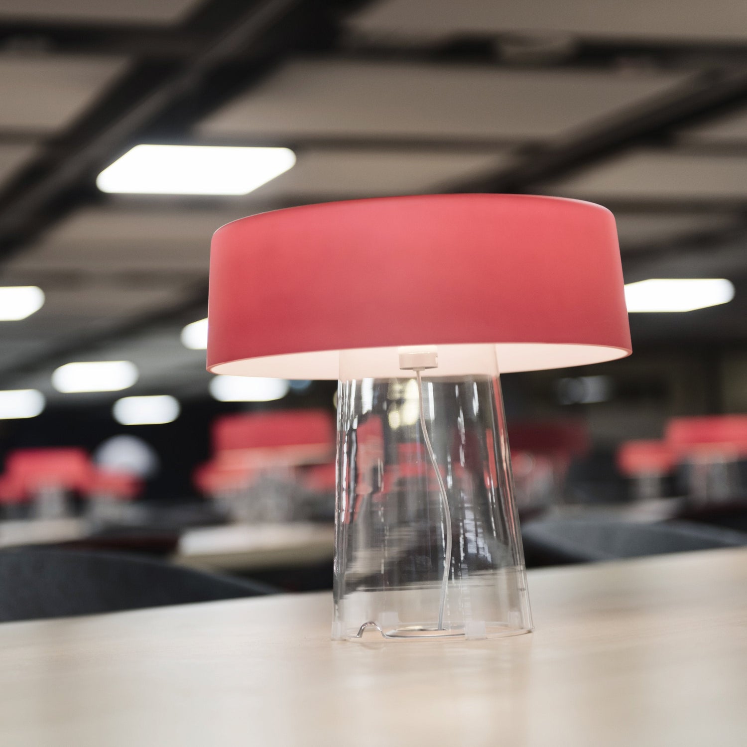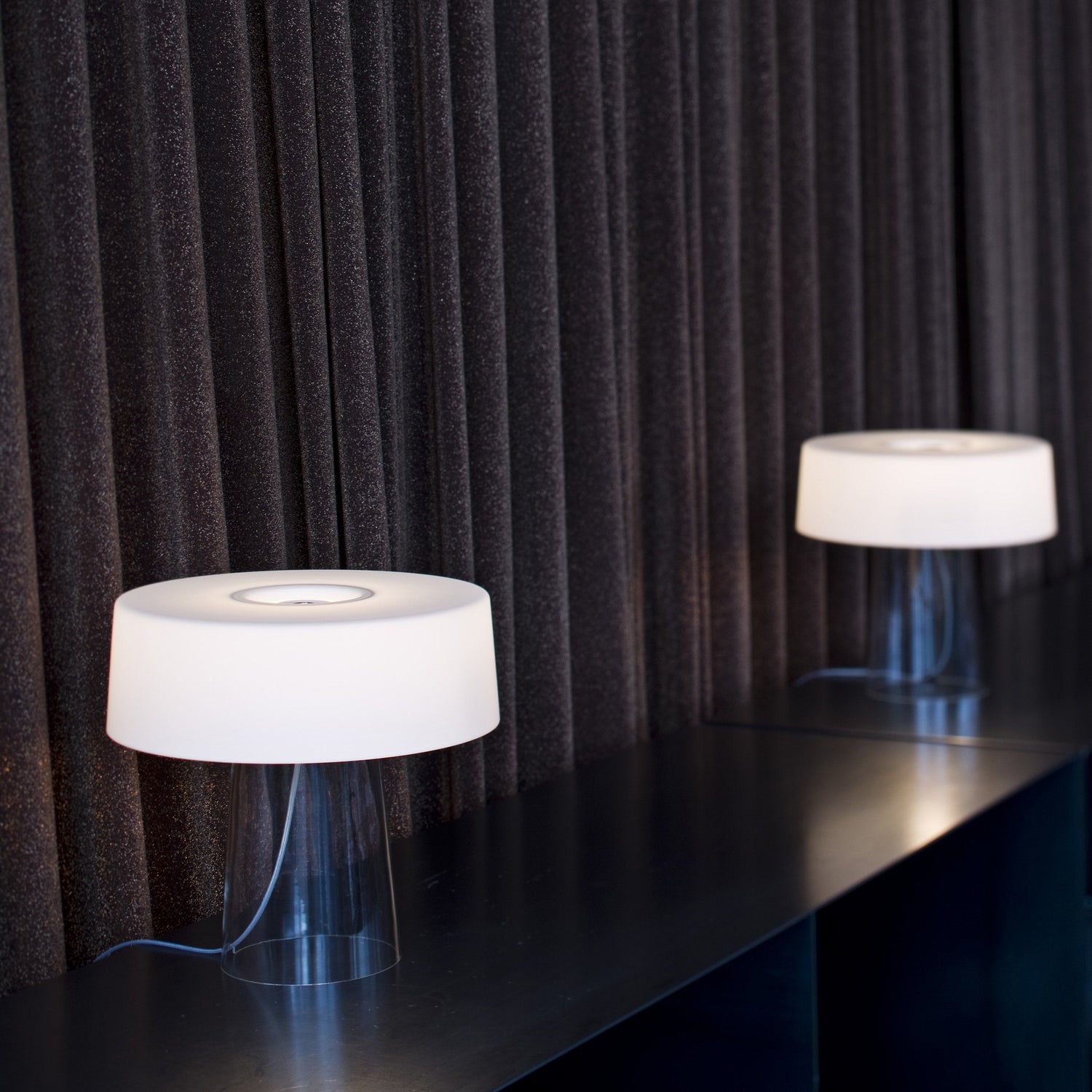 A reinterpretation of the stereotypical table lamp, the Glam Small Table Lamp designed by Luc Ramael for Prandina, is short on stature, but big on style. Consisting of two blown glass pieces balancing as one, this lamp features a clear base and white interior power cord that adds to the character of the lamp. Flank either side of a vanity for additional lighting while putting on makeup or place on side tables throughout your home for a convenient reading lamp.