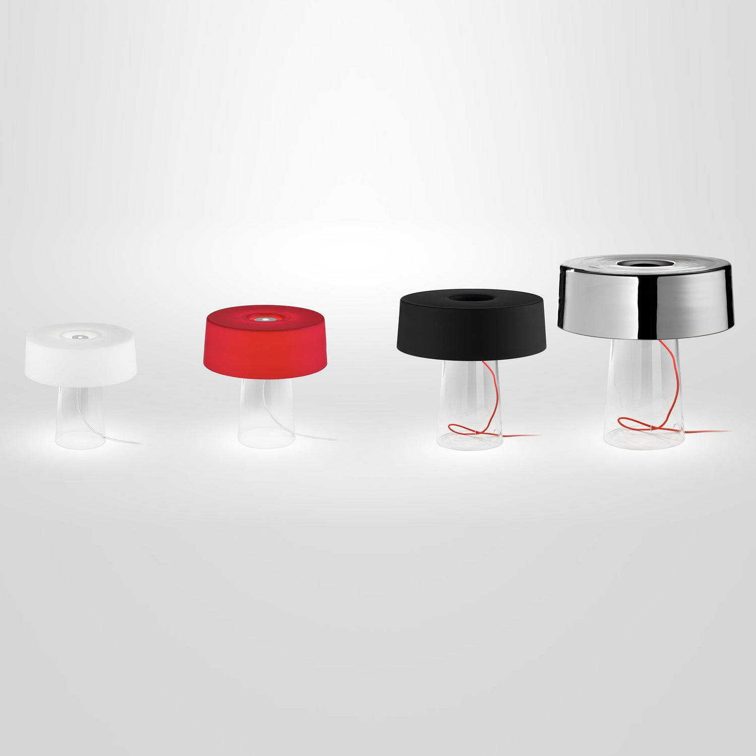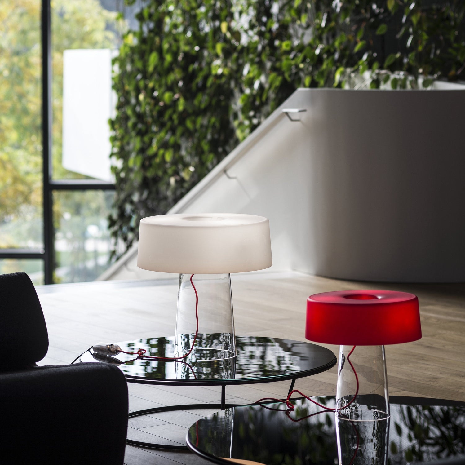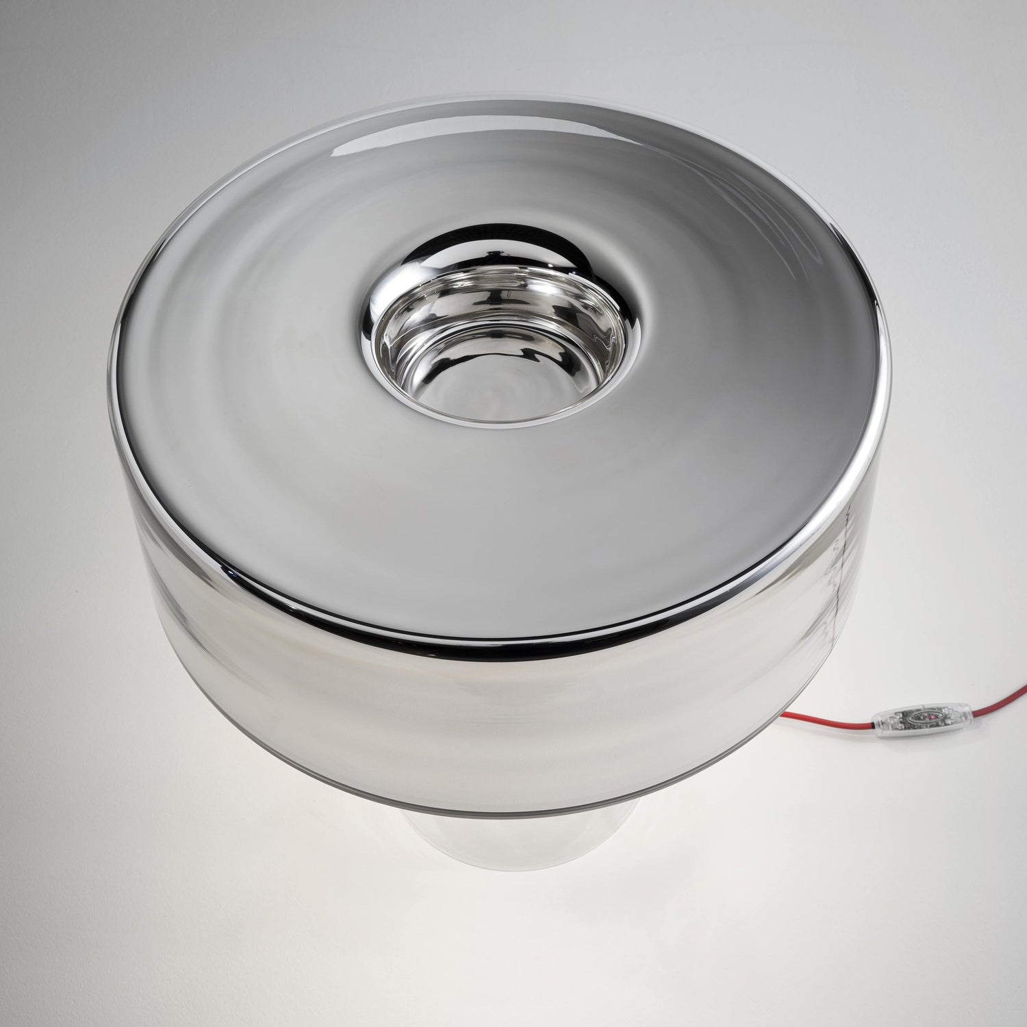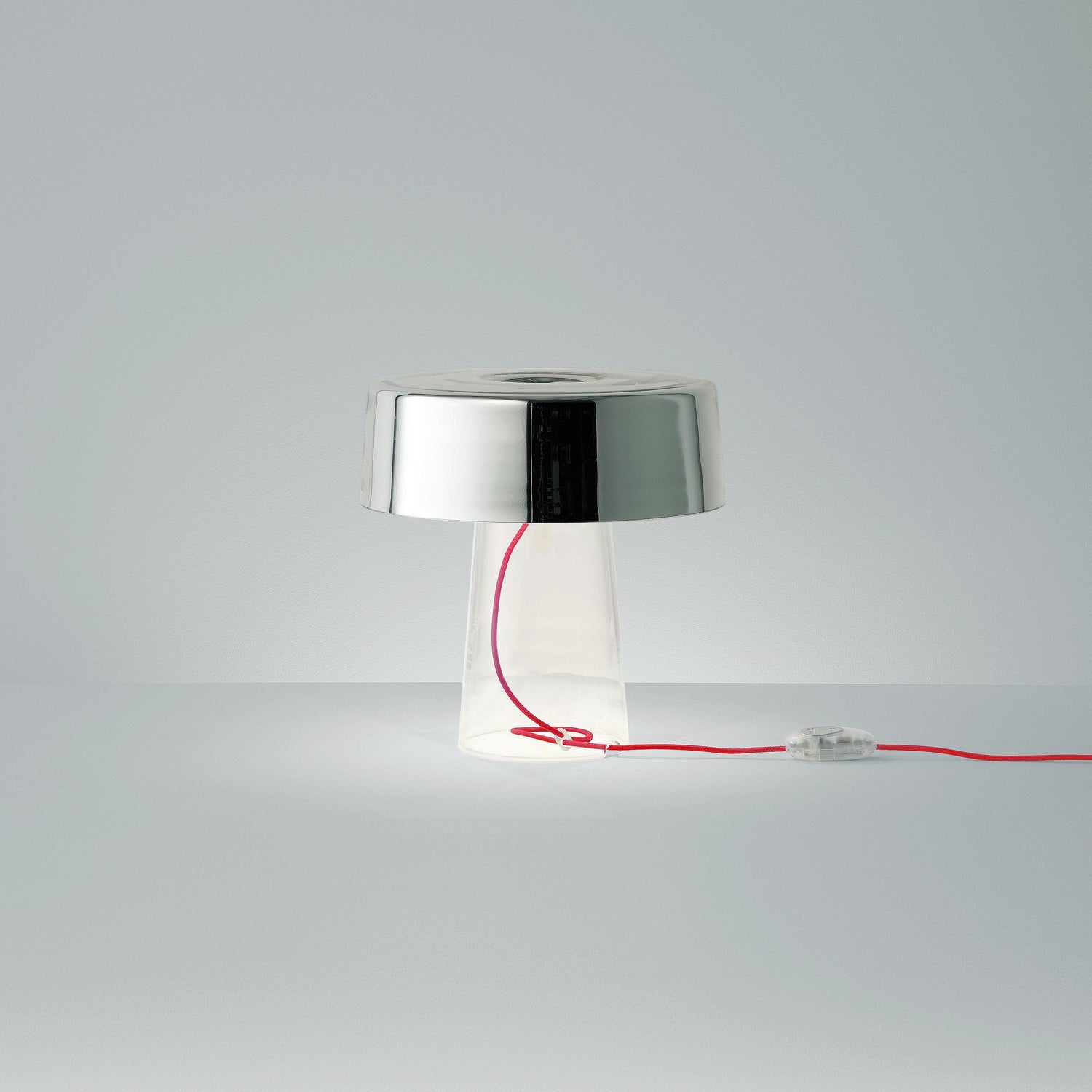 A reinterpretation of the typical table lamp, the Glam Table Lamp designed by Luc Ramael for Prandina pairs quality materials with contemporary design. Constructed from two blown glass pieces stacked on top of one another, this lamp brings a feeling that its shade is almost suspended on top. The power cord, wrapped in red polyester, brings a touch of character to offset the glam finishes of the lamp. Assisted by a built-in dimmer, this lamp is suitable as a bedside companion or as a desk-top light source to finish paperwork in style.