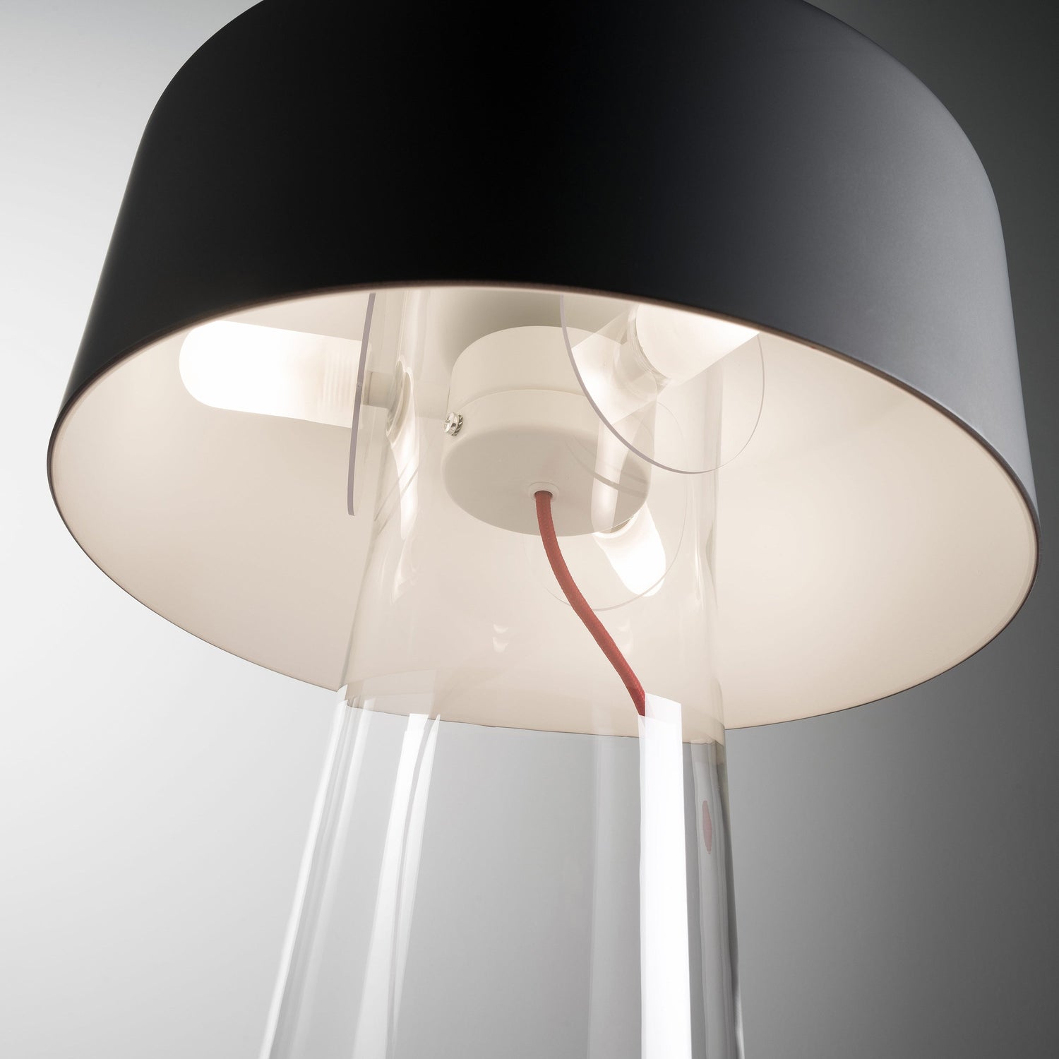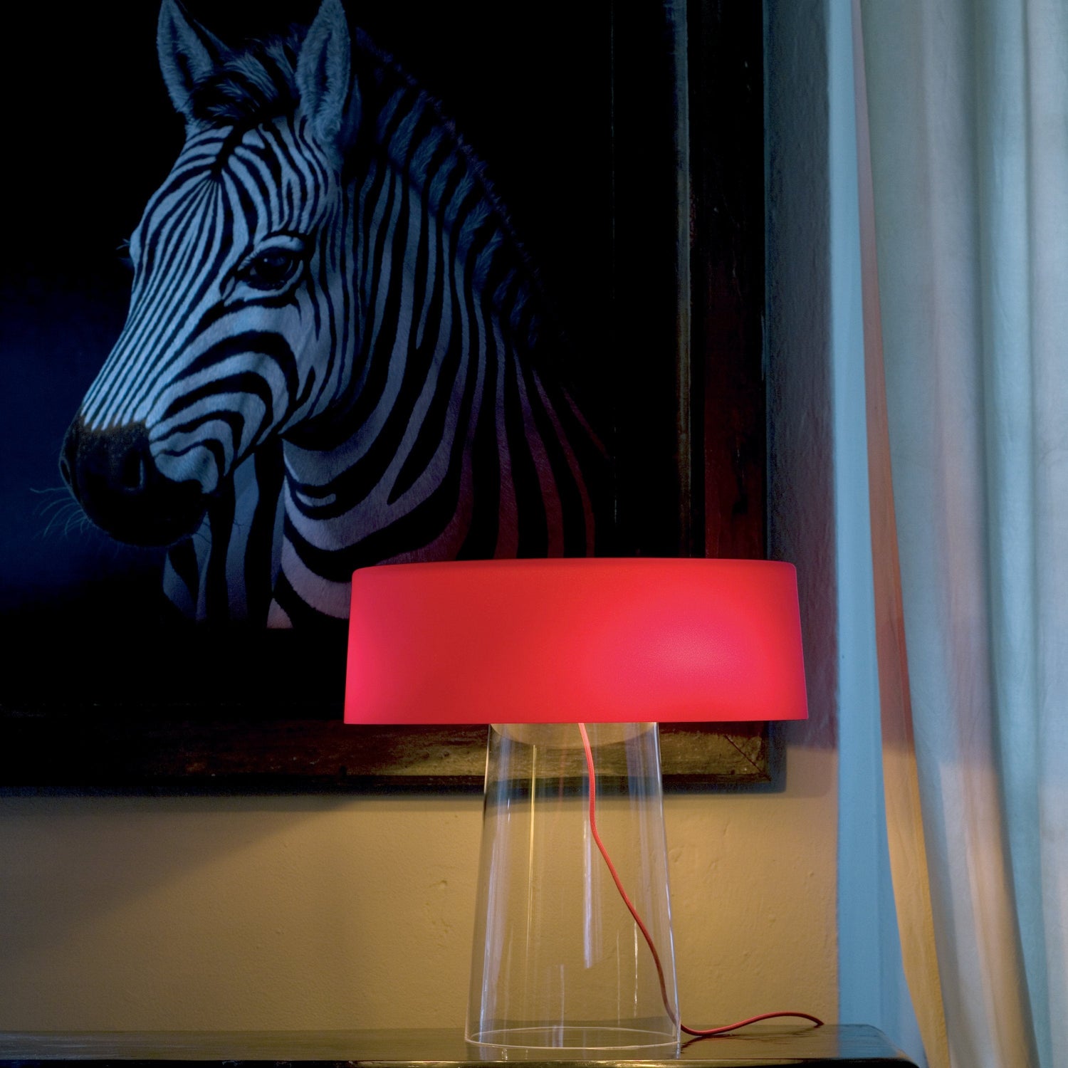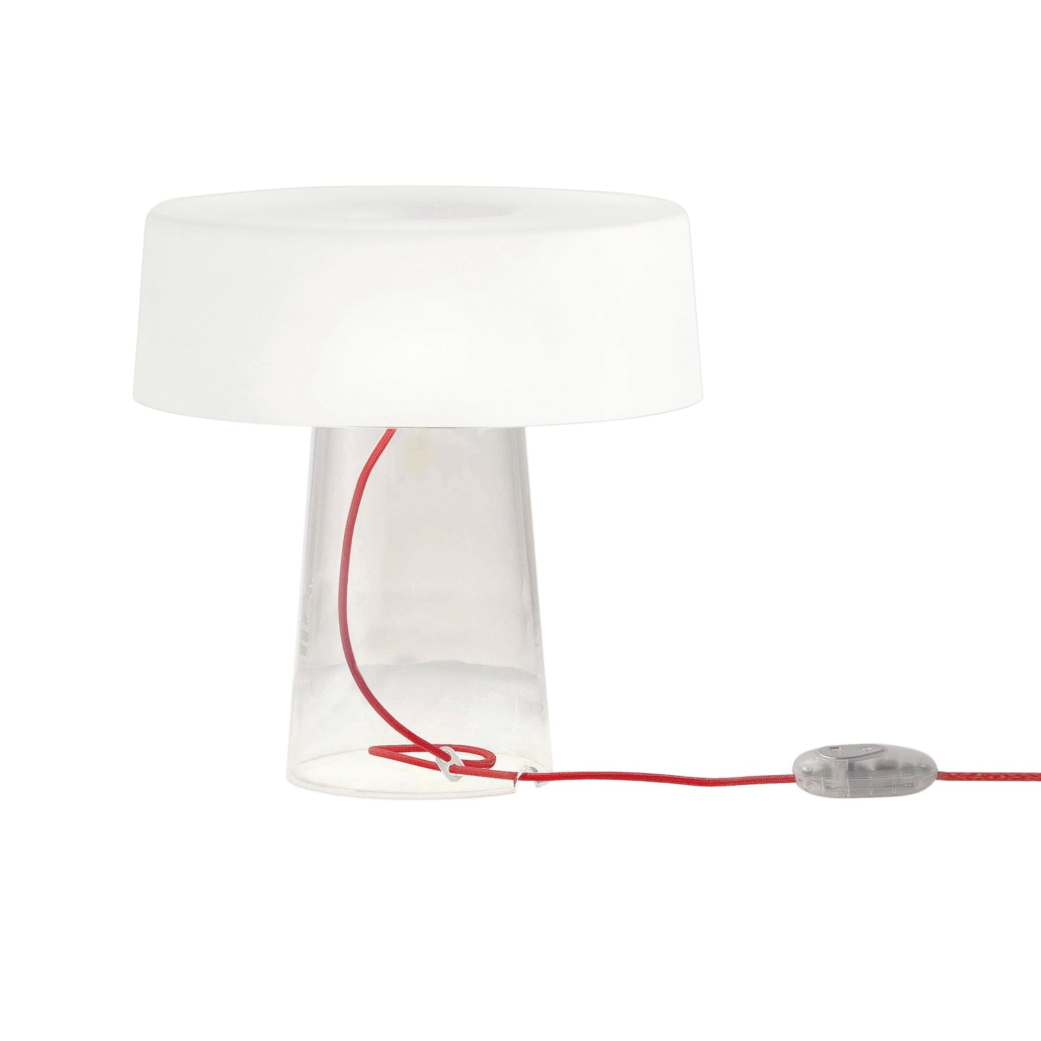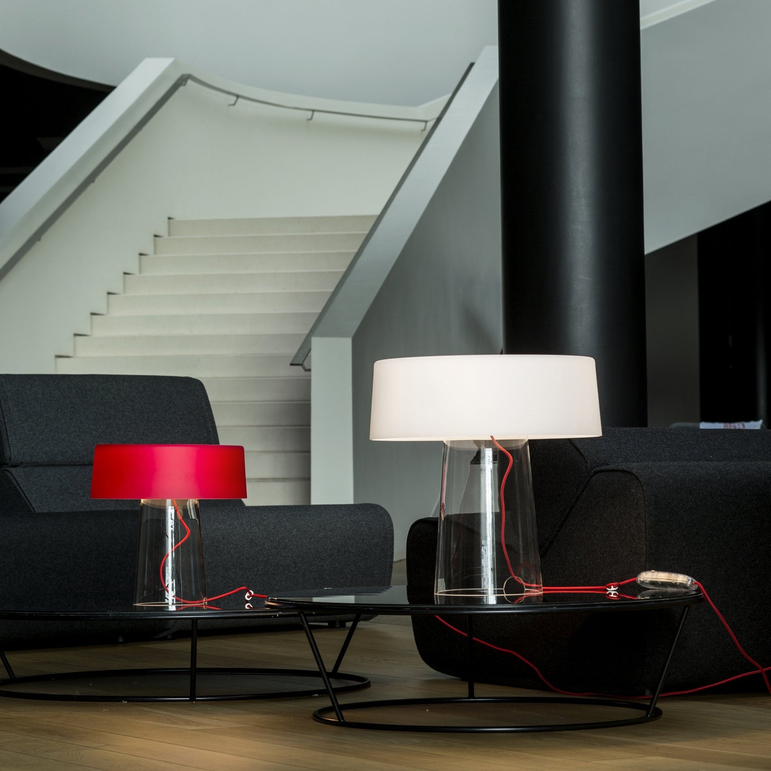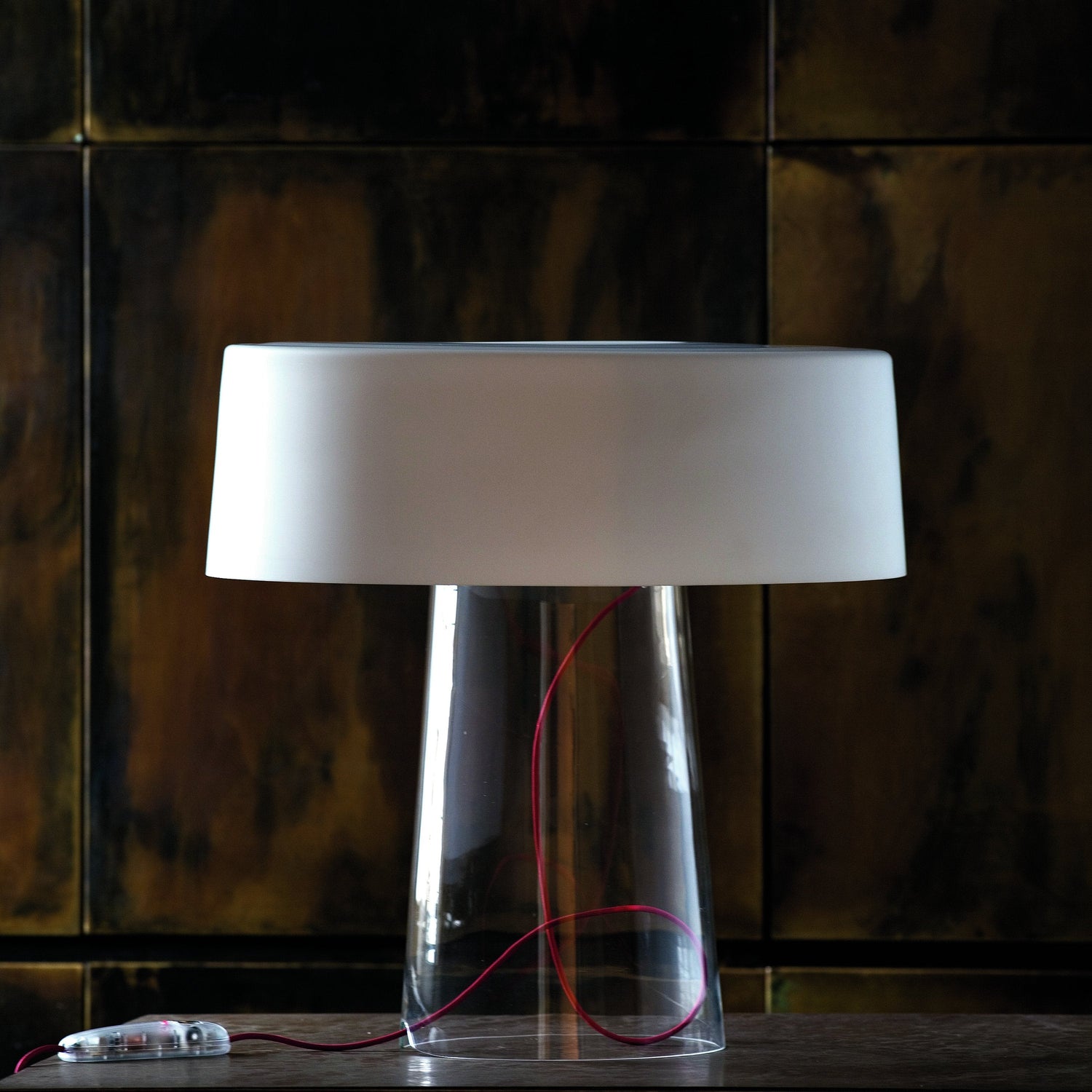A reinterpretation of the typical table lamp, the Glam Table Lamp designed by Luc Ramael for Prandina pairs quality materials with contemporary design. Constructed from two blown glass pieces stacked on top of one another, this lamp brings a feeling that its shade is almost suspended on top. The power cord, wrapped in red polyester, brings a touch of character to offset the glam finishes of the lamp. Assisted by a built-in dimmer, this lamp is suitable as a bedside companion or as a desk-top light source to finish paperwork in style.