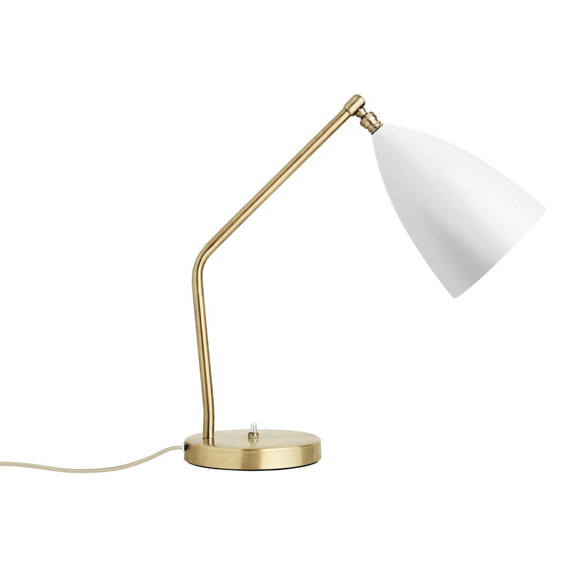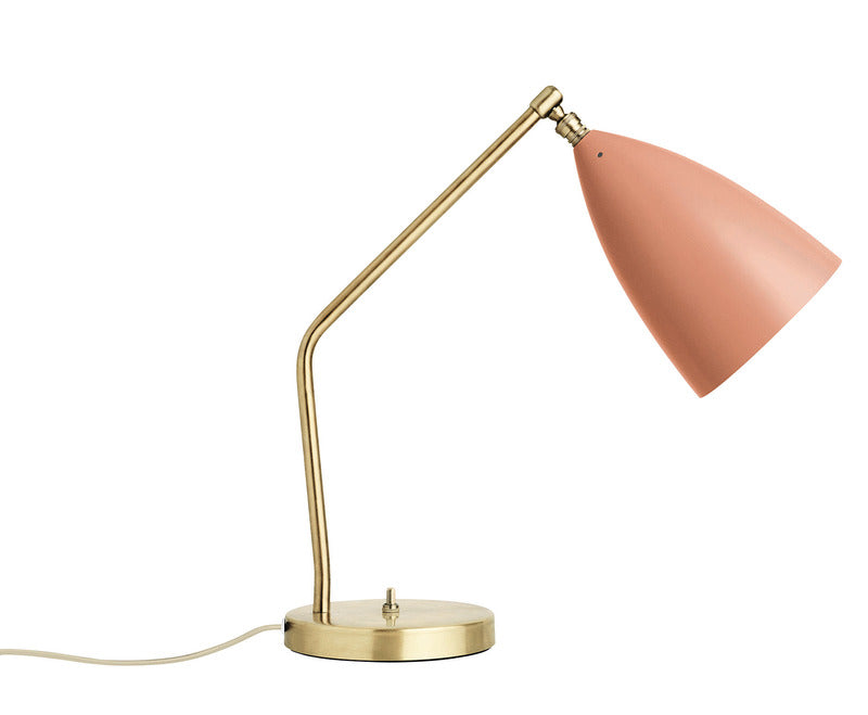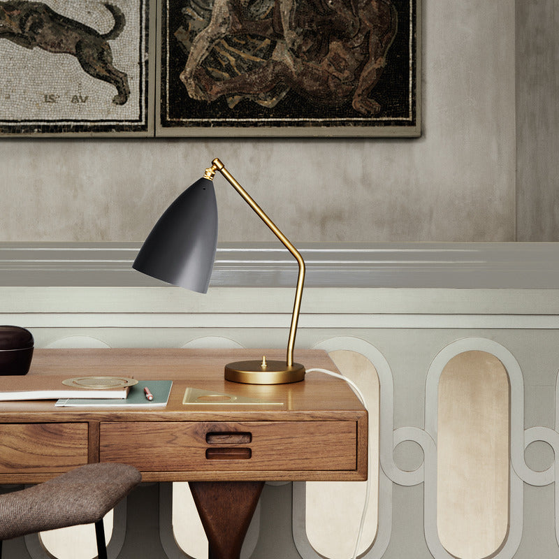 The iconic Grashoppa task lamp was first produced in 1948. The tubular brass stand is mounted on a brass base whilst the elongated conical steel shade is mounted with a moveable joint in solid brass, consequently the light can be directional, yet the glare is minimal.