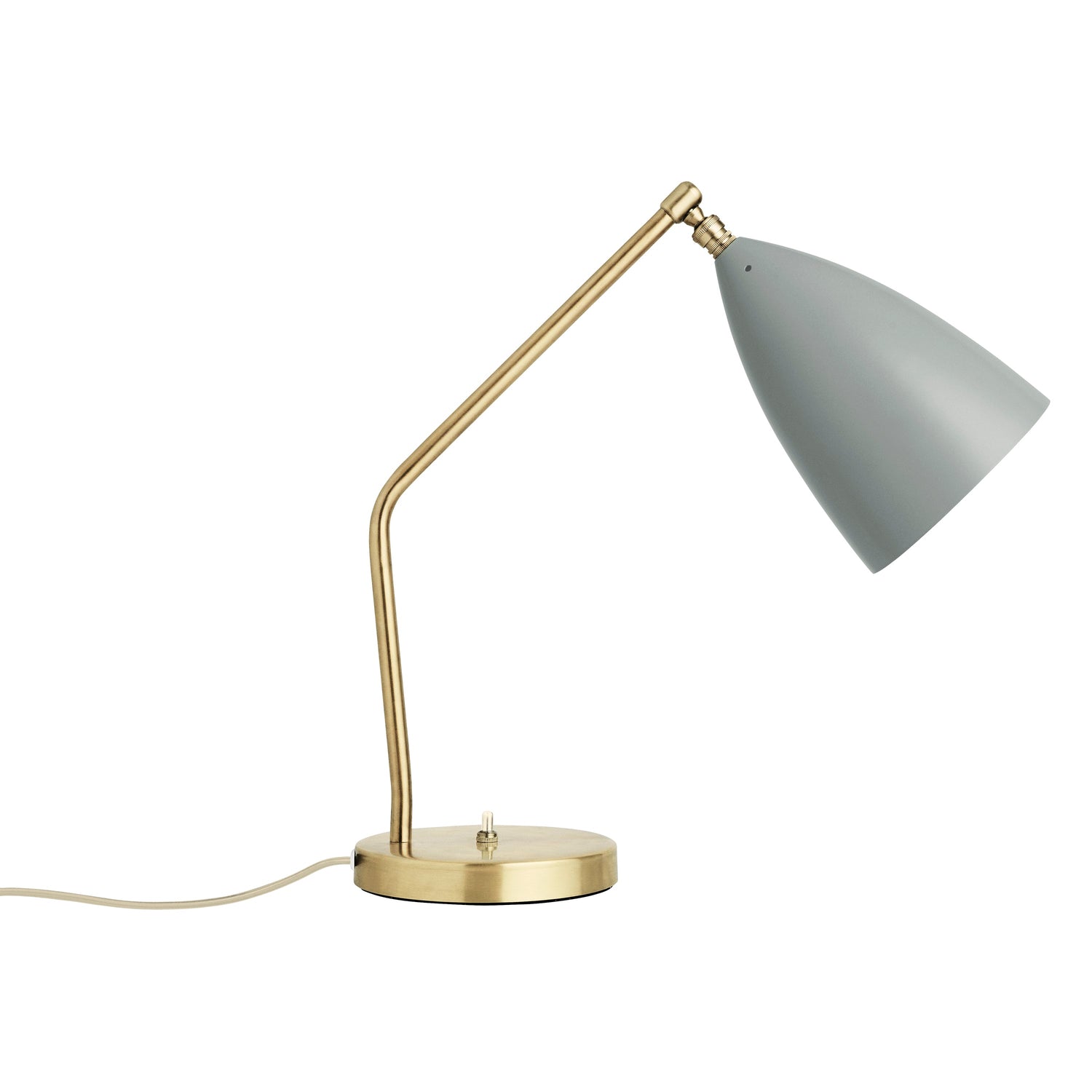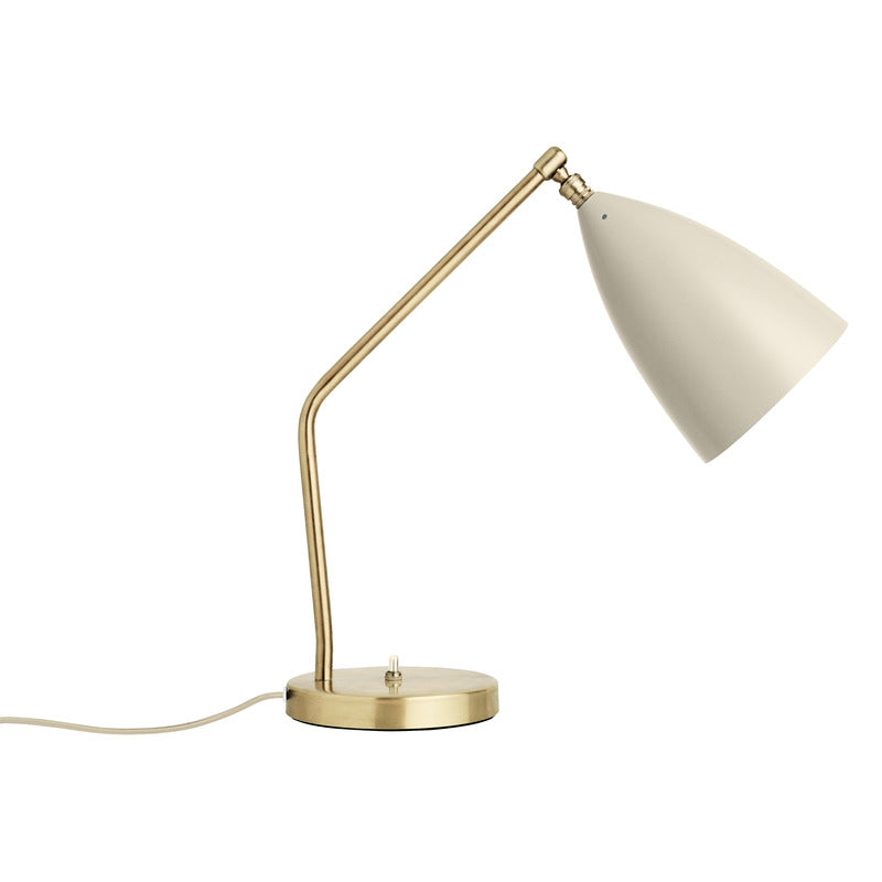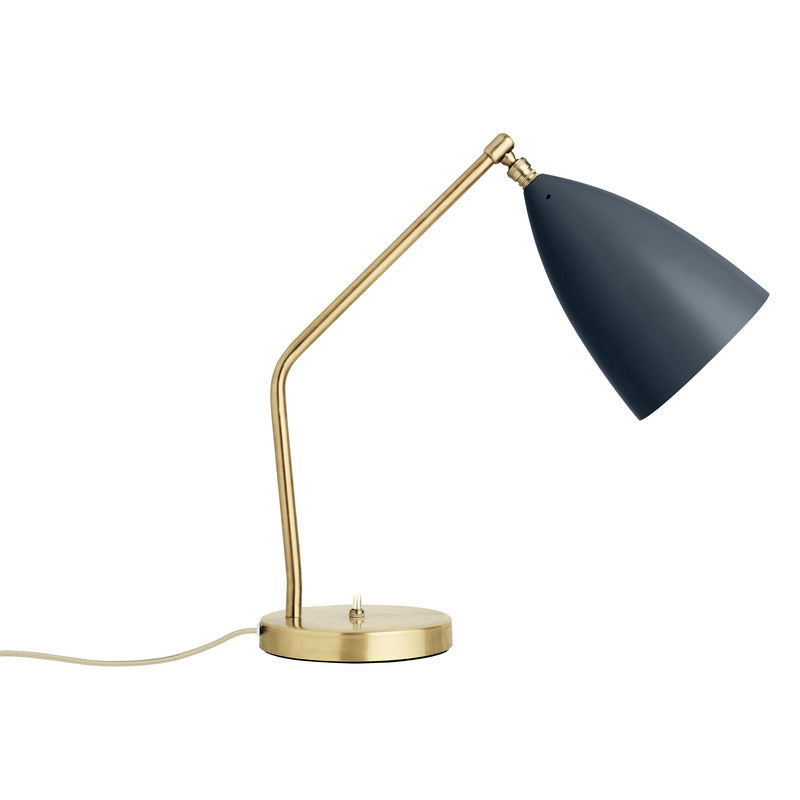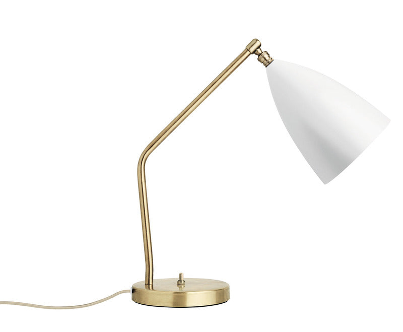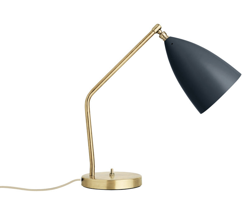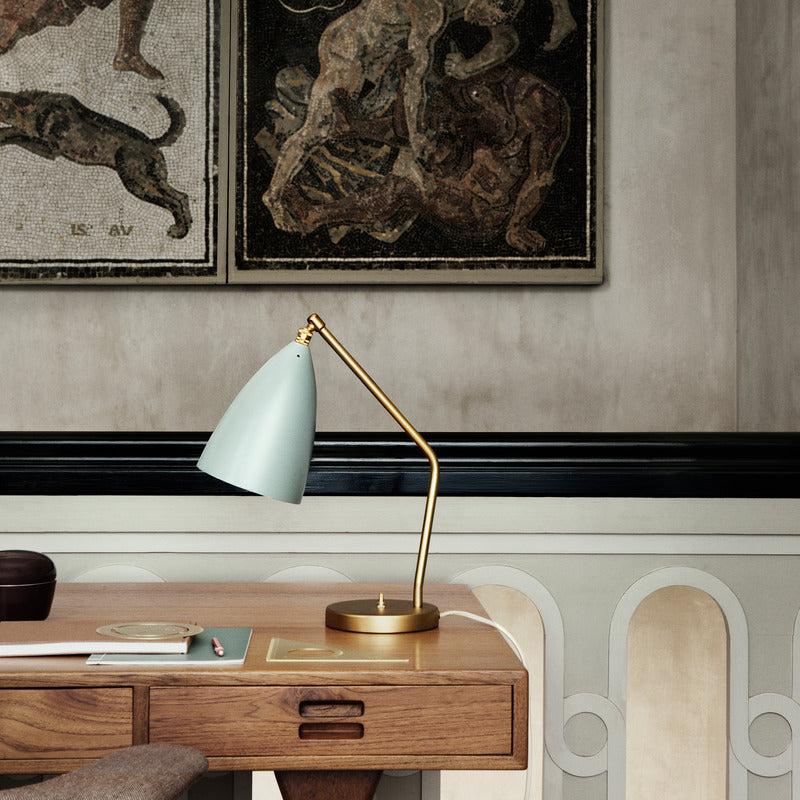 The iconic Grashoppa task lamp was first produced in 1948. The tubular brass stand is mounted on a brass base whilst the elongated conical steel shade is mounted with a moveable joint in solid brass, consequently the light can be directional, yet the glare is minimal.