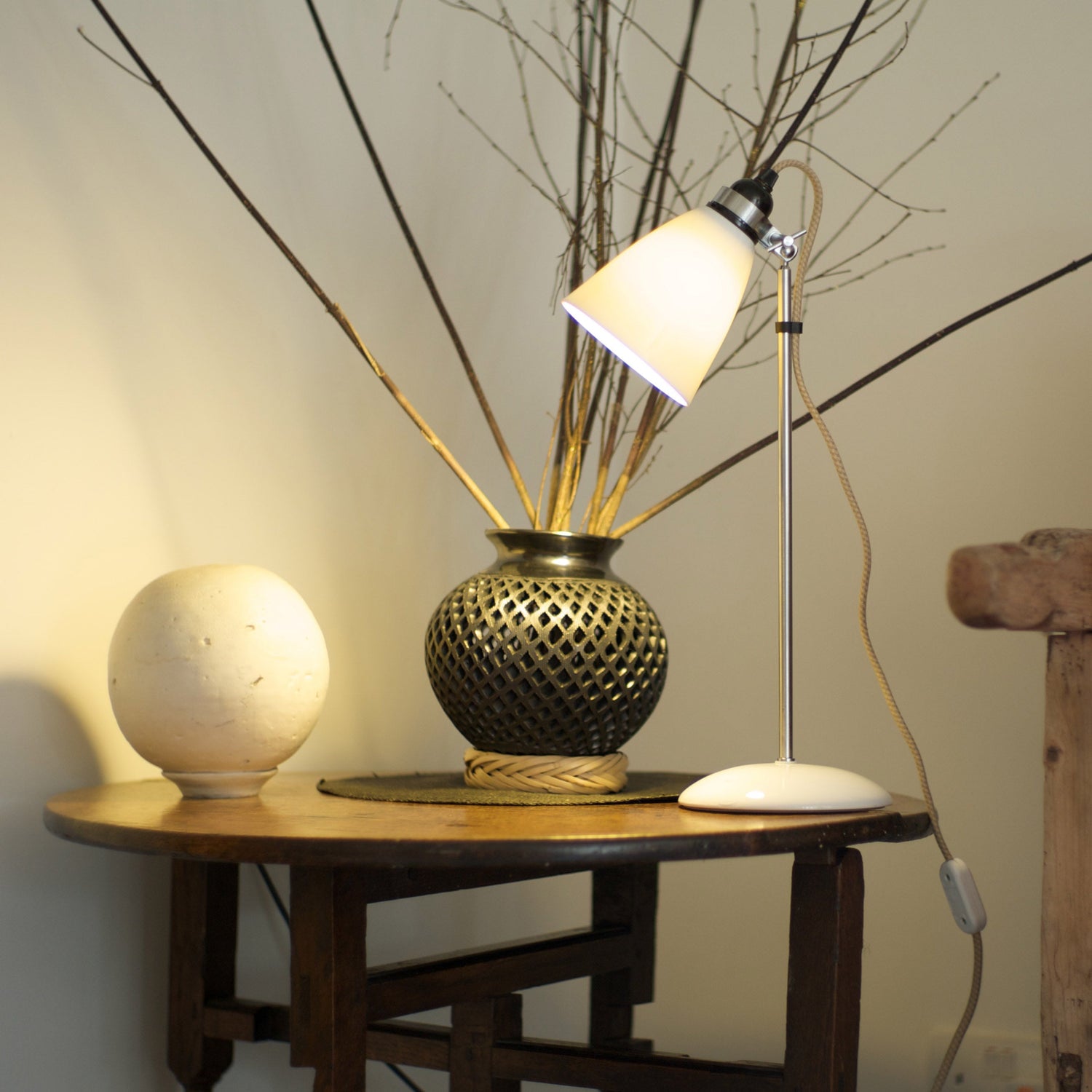 A British design classic in translucent bone China. With its moveable shade and smart cotton braided flex, the Hector table light and its accompanying floor light perfectly marry style and function. The range includes a selection of simple bone China pendants and practical, space-saving wall lights for a subtle source of ambient light.