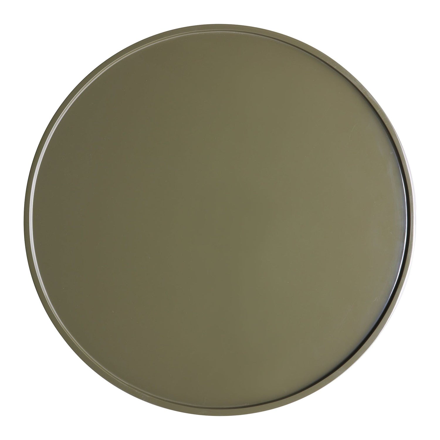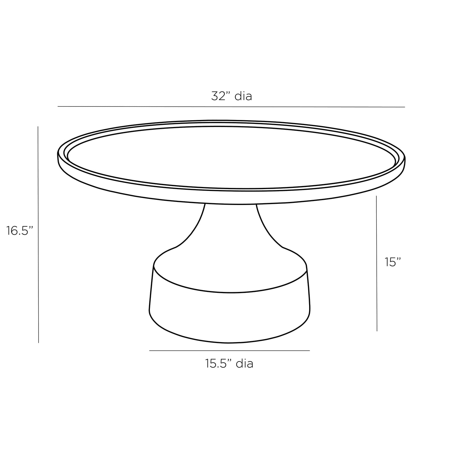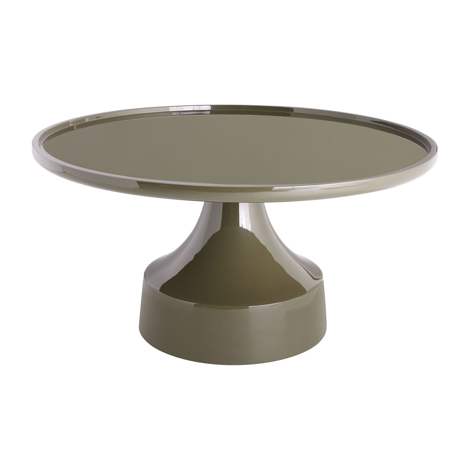 Contemporary design elements take shape in this ultra-mod cocktail table. A round top framed by a raised rim rests atop an exaggerated tapered base, exhibiting sculptural characteristics that draw the eye. A rich dark moss lacquer finish provides a subtle color to enhance the modern shape.