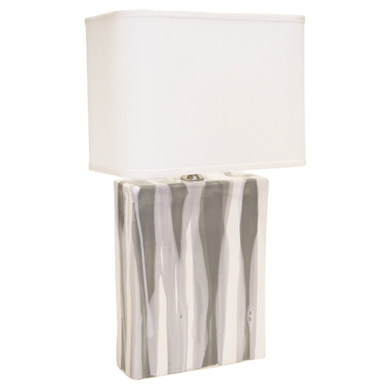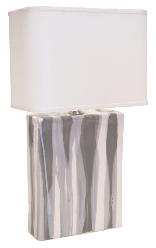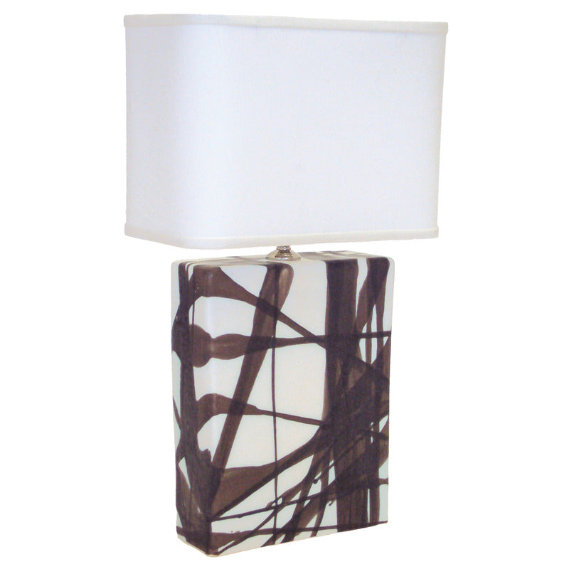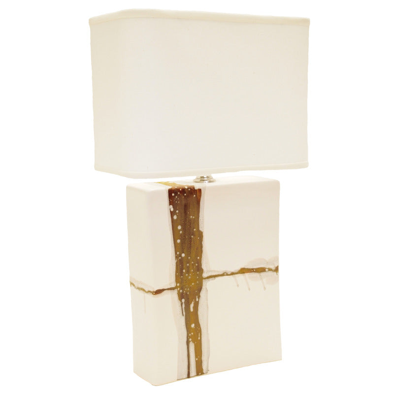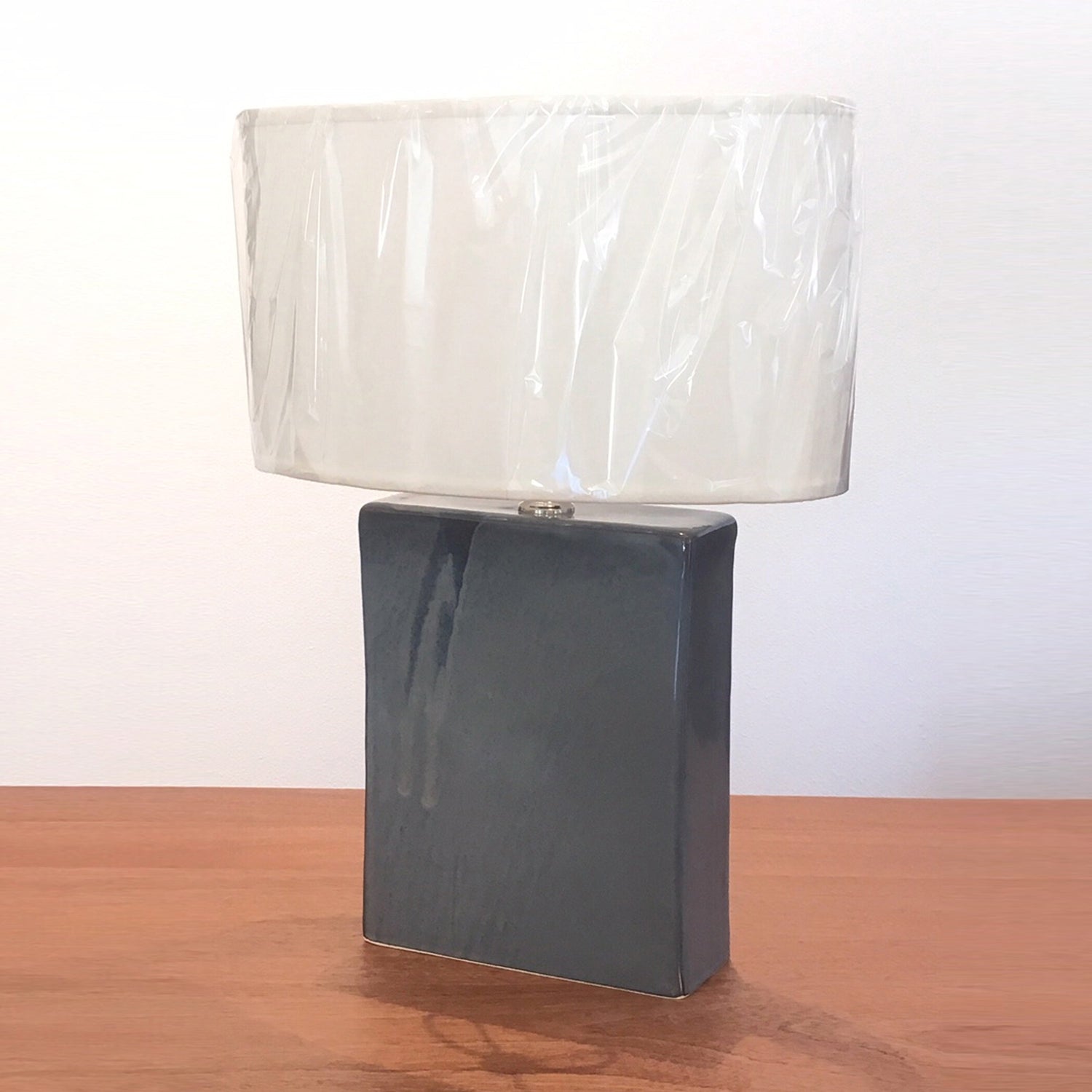 Hand crafted in a studio on their olive orchard in northern California from a high-fire stoneware clay. All lamps come with a cream linen shade and use a 3-way bulb up to 100 watts.