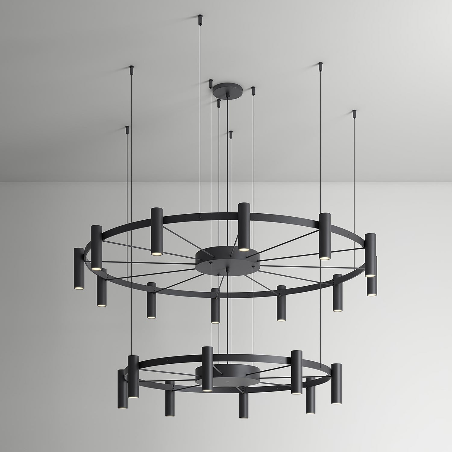 The chandelier re-imagined as a stylized wheel, with cylindrical lamps which can project light up and down. Laverd R11S.1S1M istwo tieredand can be combined or vertically connected. A central element suspended from steel cables permits the creation of different shapes.