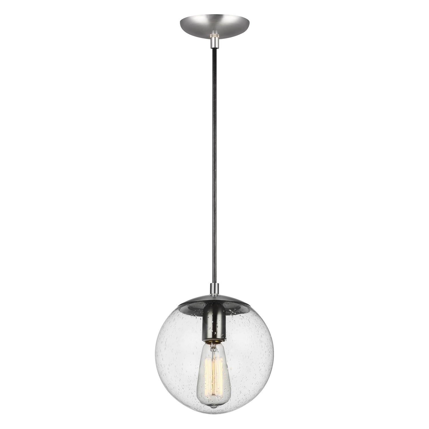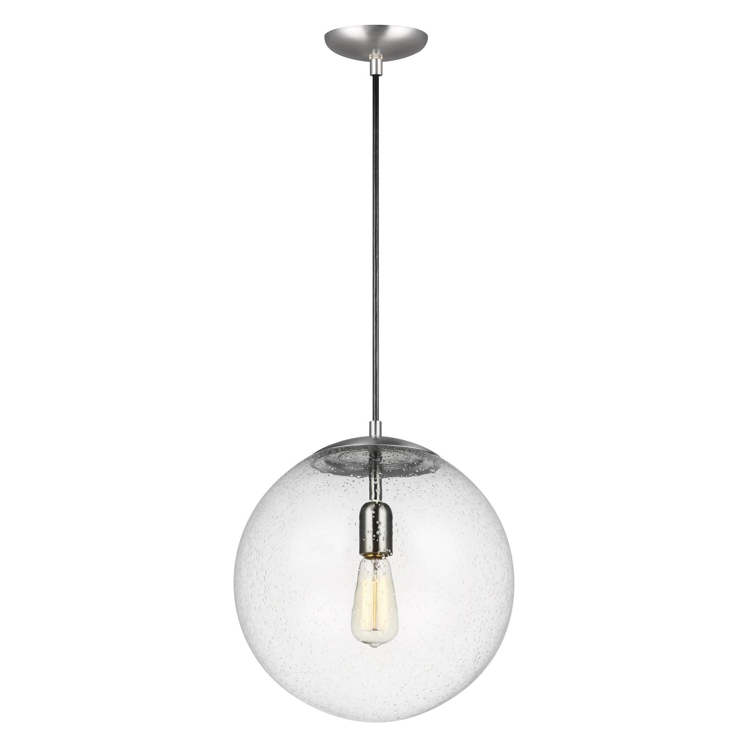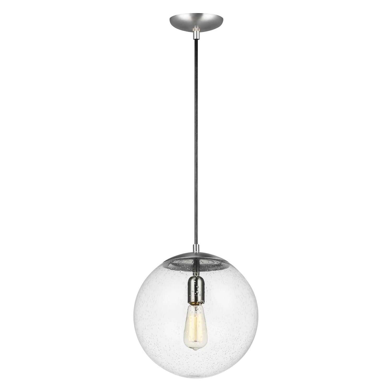 While hanging globes are one of lighting's hottest trends, Sea Gull's timeless Leo Collection has been around for 50 years! Constantly evolving with the times, these classic pendants are now offered with NEW Clear Seeded glass and in Satin Aluminum finish. Adjustable cloth cords allow for unlimited variations of hanging heights. All glass softly diffuse the light, each fixture comes with 54 of cuttable cord to customize the installation exactly to your needs. All fixtures are qualified and California Title 24 compliant and damp rated for use in sheltered, damp environments like bathrooms, covered patios or porches.