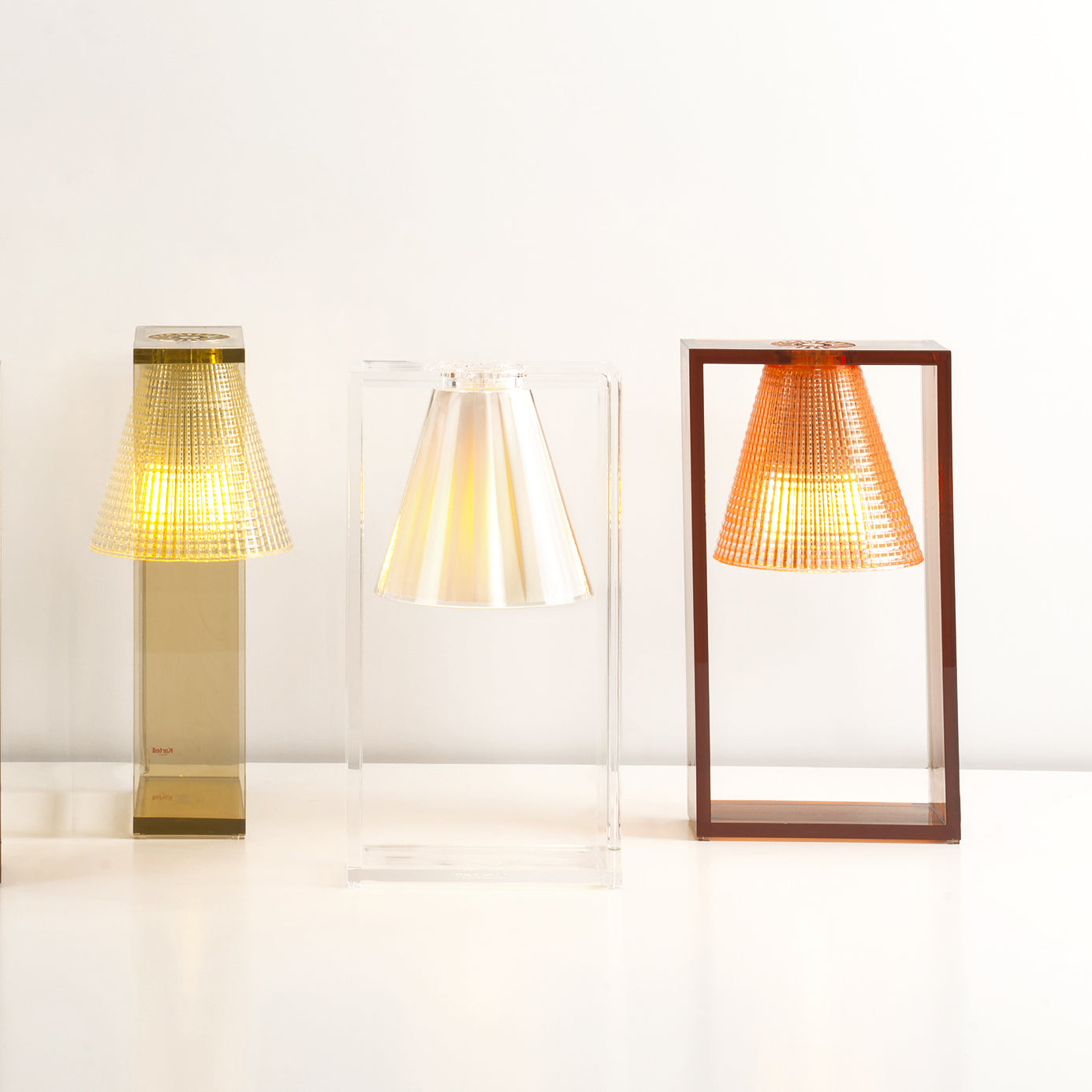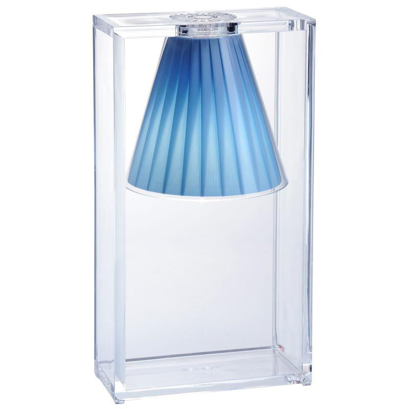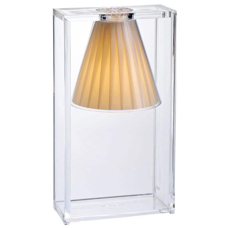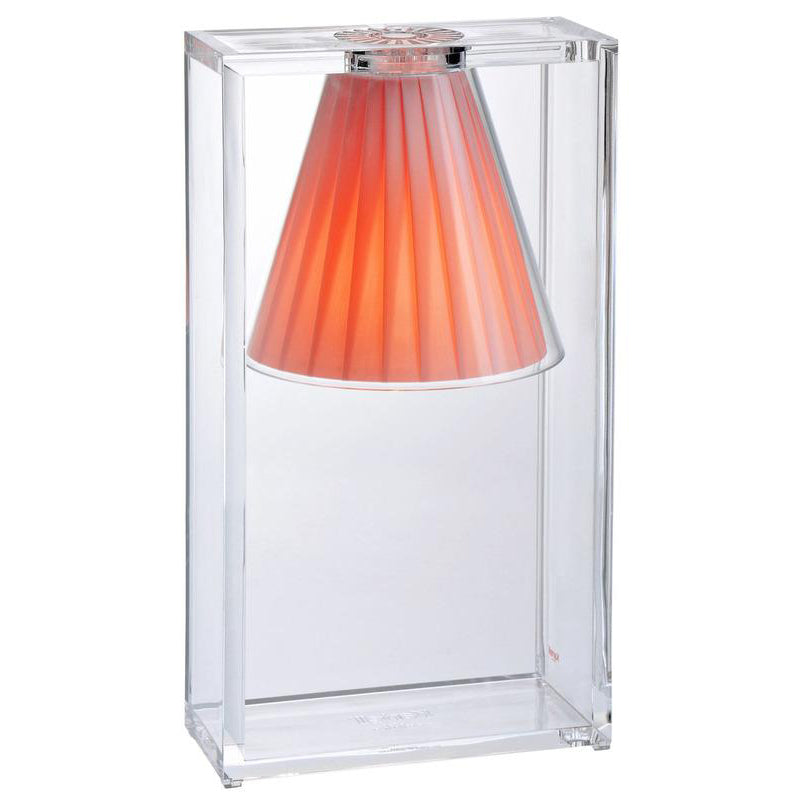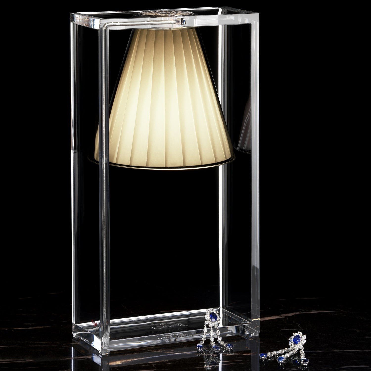 An illusionist table lamp, a suspended light that eludes the laws of gravity. Light-air is essential, modern and rational, but at the same time it produces a magic effect. Its structure is a strong graphic statement composed of a rectangular frame formed of two pieces of transparent or mass-colored thermoplastic technopolymer containing a pleated fabric conical parabola.