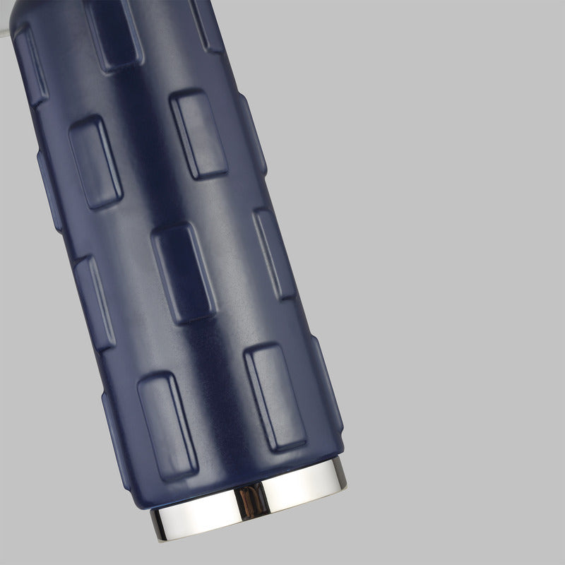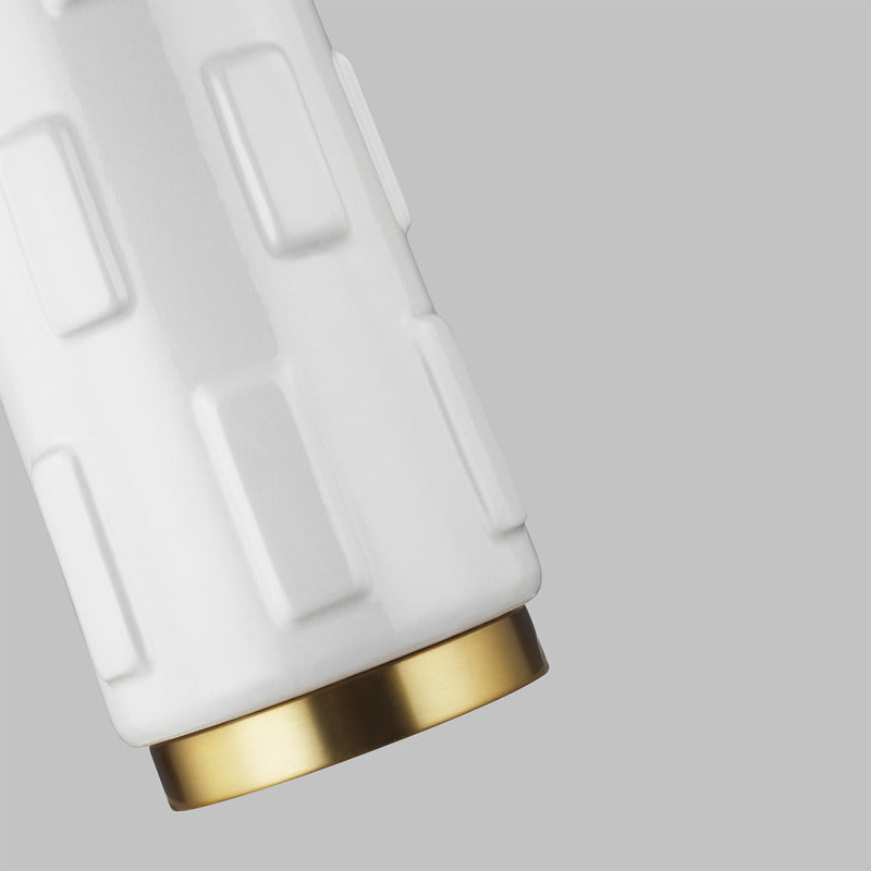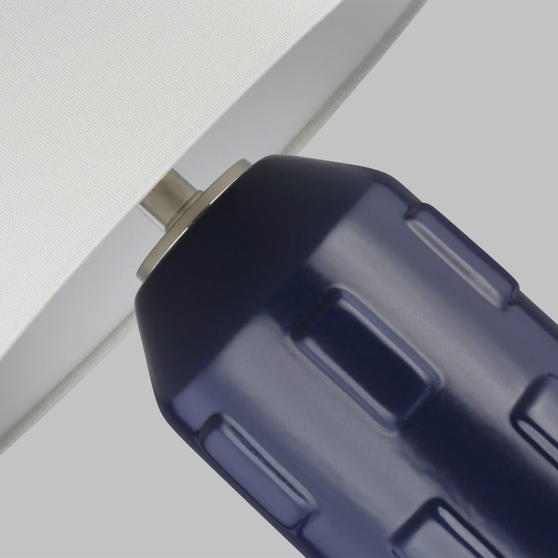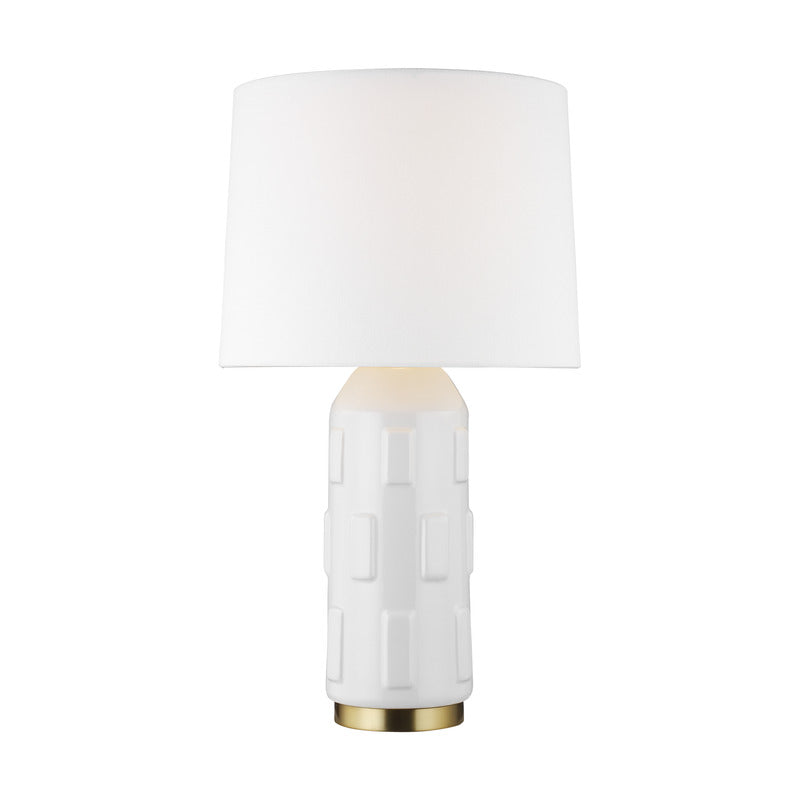 The Chapman and Myers Morada table lamp features a simple, geometric textured pattern on its ceramic base, which comes in three colors. Topped with a white linen shade and complimented by Burnished Brass or Polished Nickel hardware.
