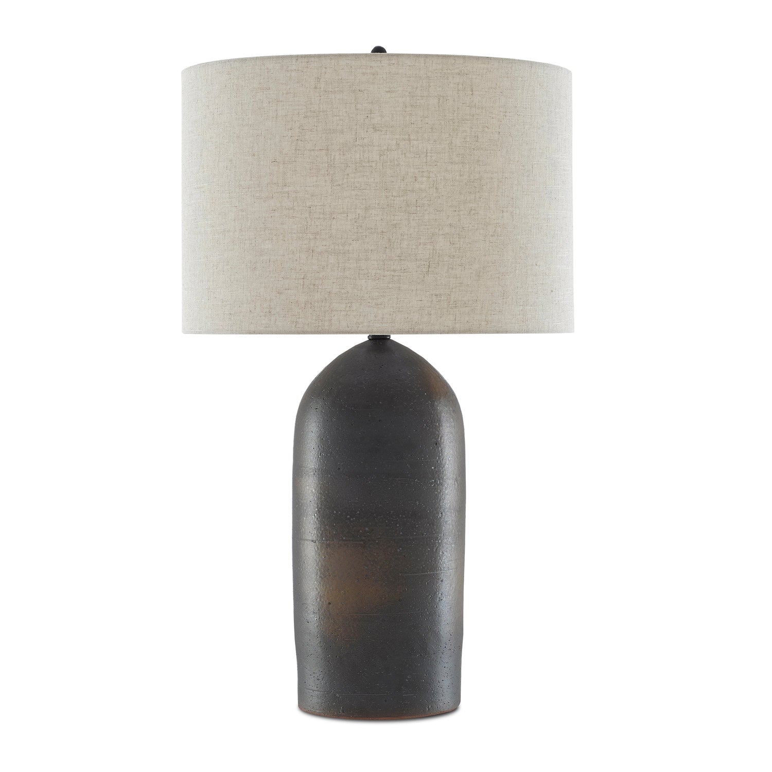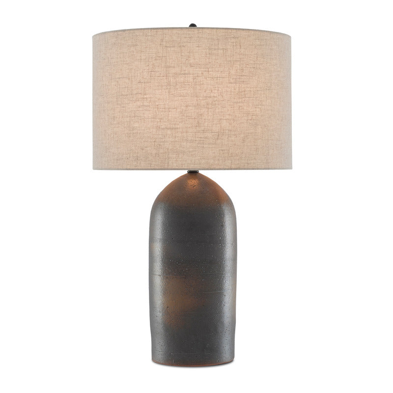 The torpedo-shaped body of the Munby Table Lamp has subtle variations in texture. Made of rust-colored and iron-hued ceramic, the dark gray tones dominate on the lamp's body, though the rust patches bring it its personality. Metal hardware in a semi-glossy black finish and a matching finial secure the natural linen shade to the gray lamp.