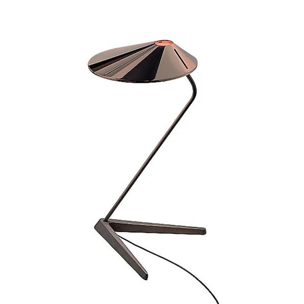 Lightweight asymmetrical conical LED table lamp made of aluminum finished in Chrome and White lacquer. Polycarbonate diffuser covering Osram LED panel. Touch dimming switch under the lamp head.