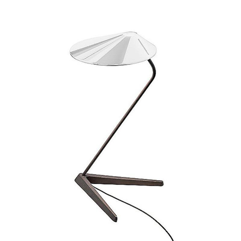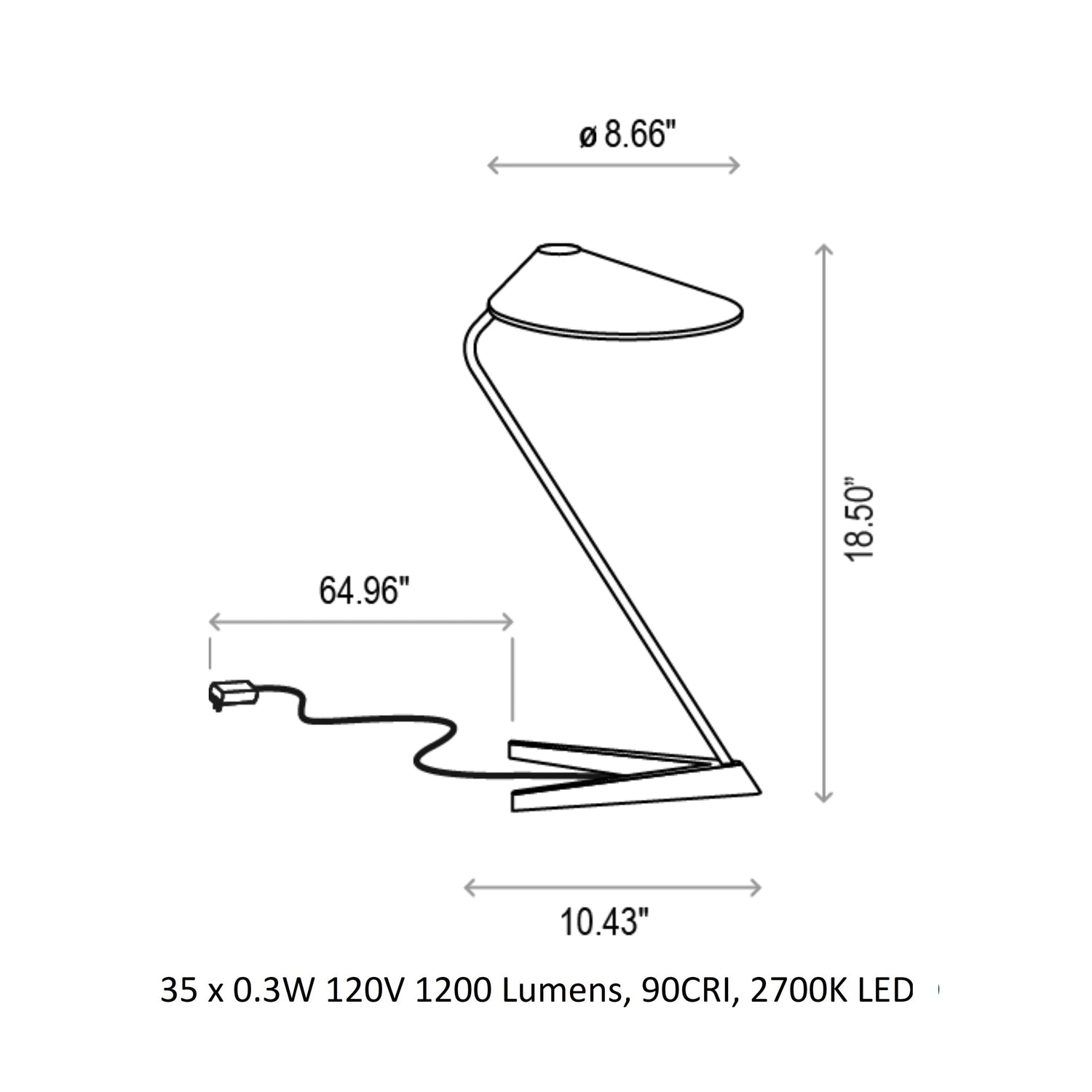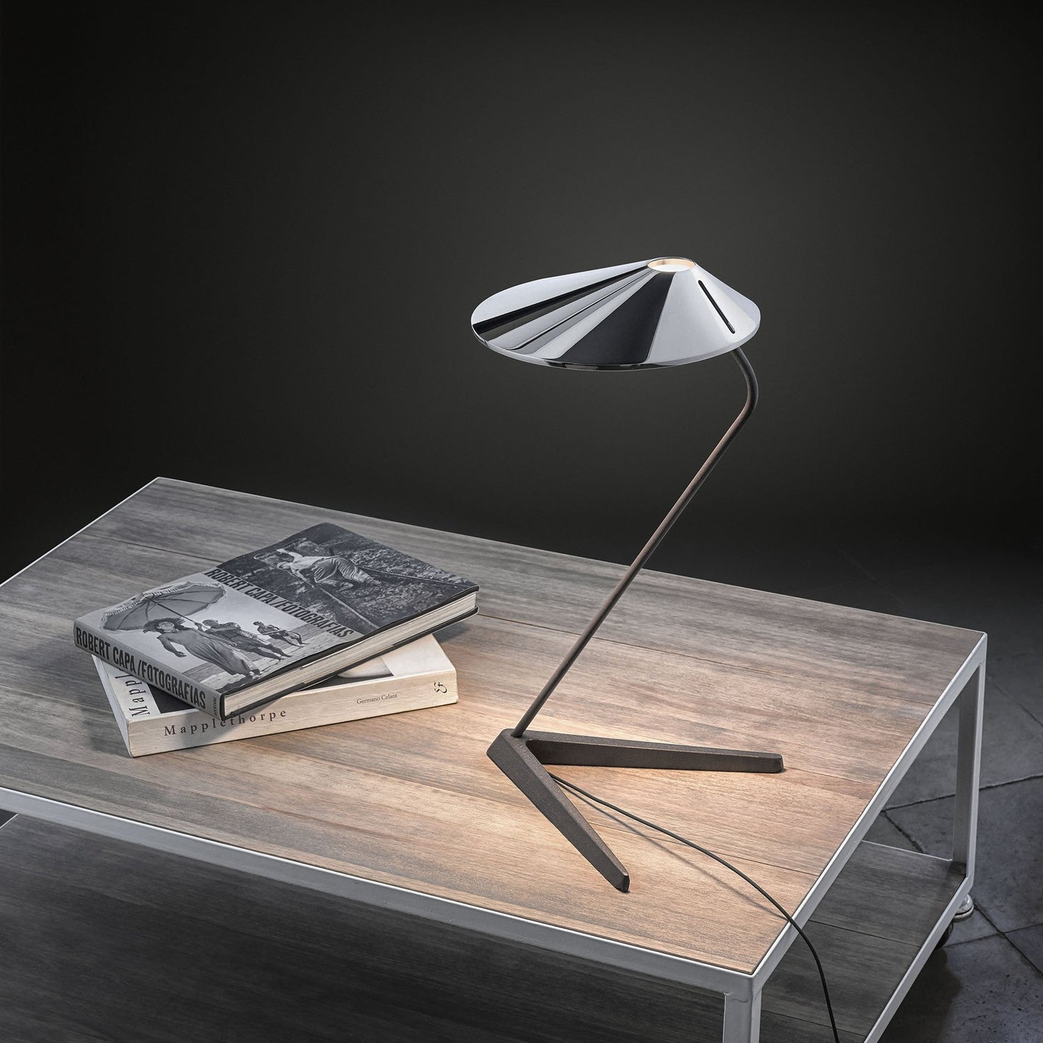 Lightweight asymmetrical conical LED table lamp made of aluminum finished in Chrome and White lacquer. Polycarbonate diffuser covering Osram LED panel. Touch dimming switch under the lamp head.