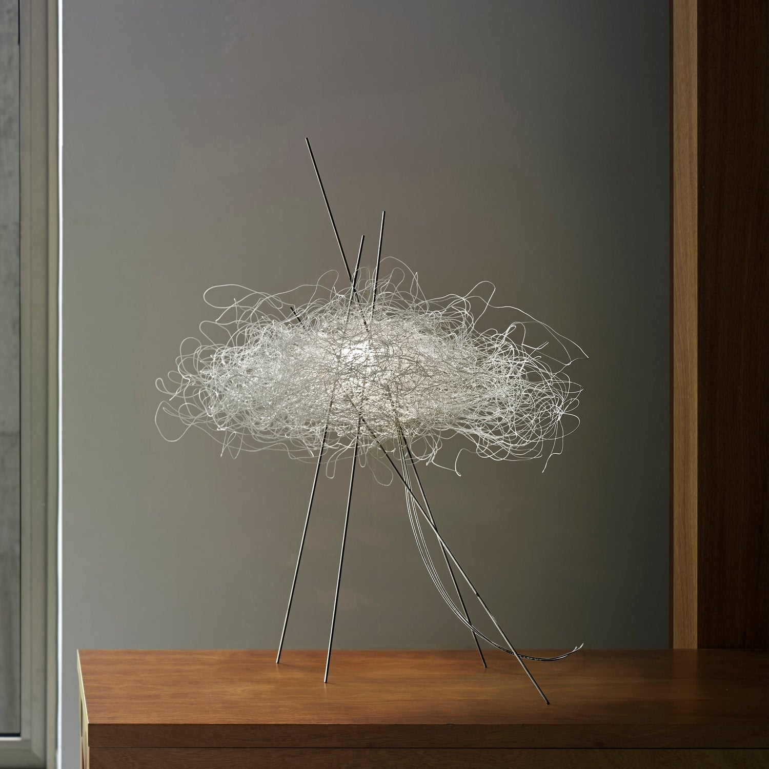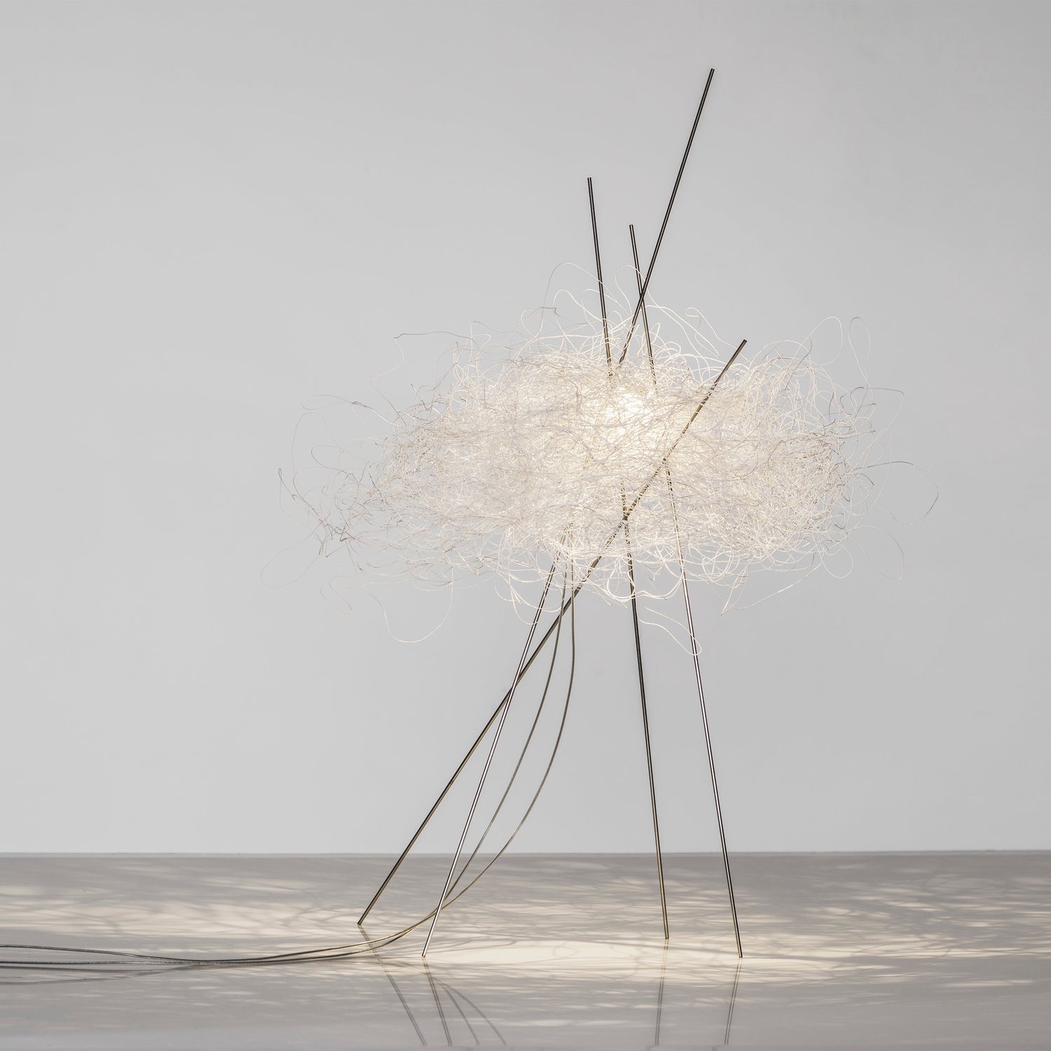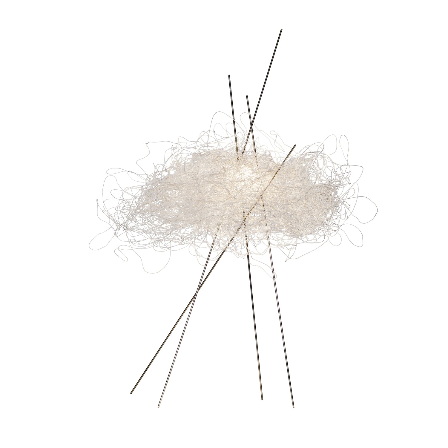 Once again, Arturo Alvarez takes the natural use of a material out of context, exploring its possibilities, achieving a surprising result. In a first approach, he begins with a cold steel thread, and plays with it, embroiling it over and over again, composing organic elements, converting it, with this gesture, in something warm. A whole universe of forms with subtle and delicate elegance, emerge from this work, with an extraordinary light escaping through them. The stainless steel, with a white finish, is a resistant and compact material that withstands the pass of time.