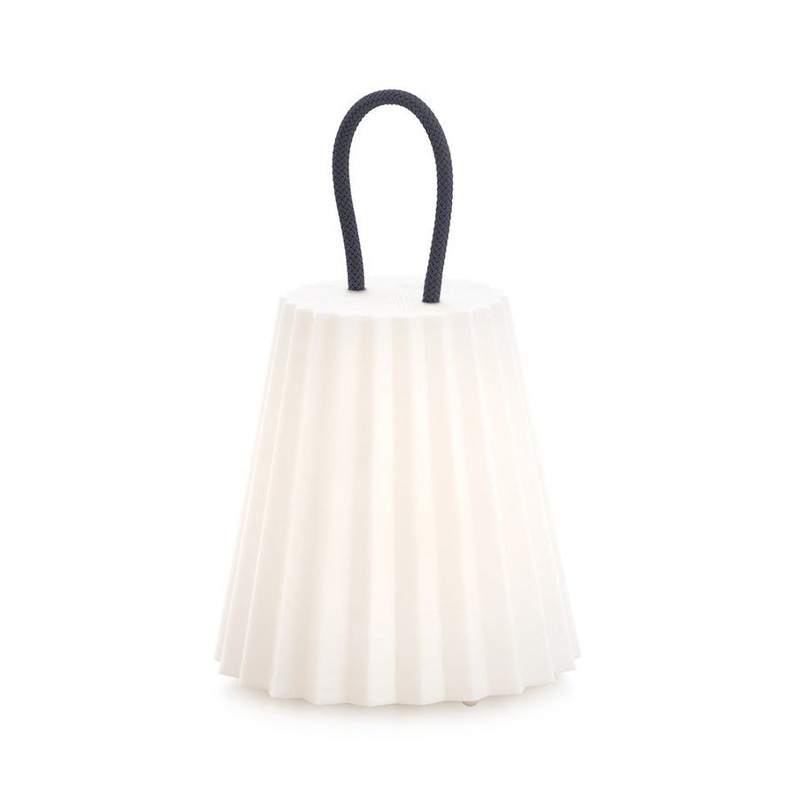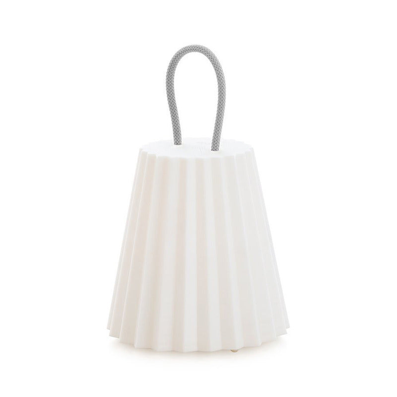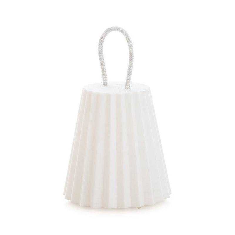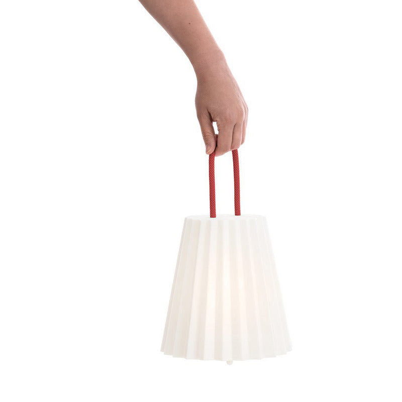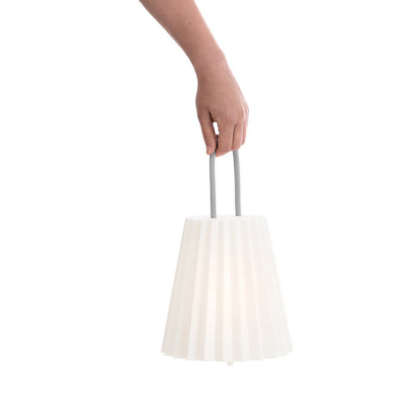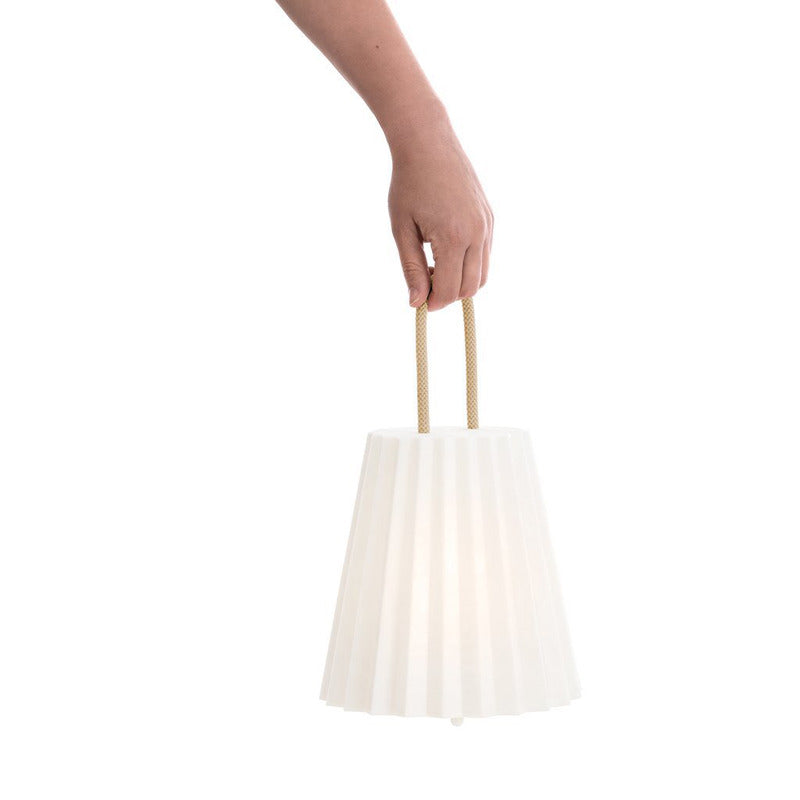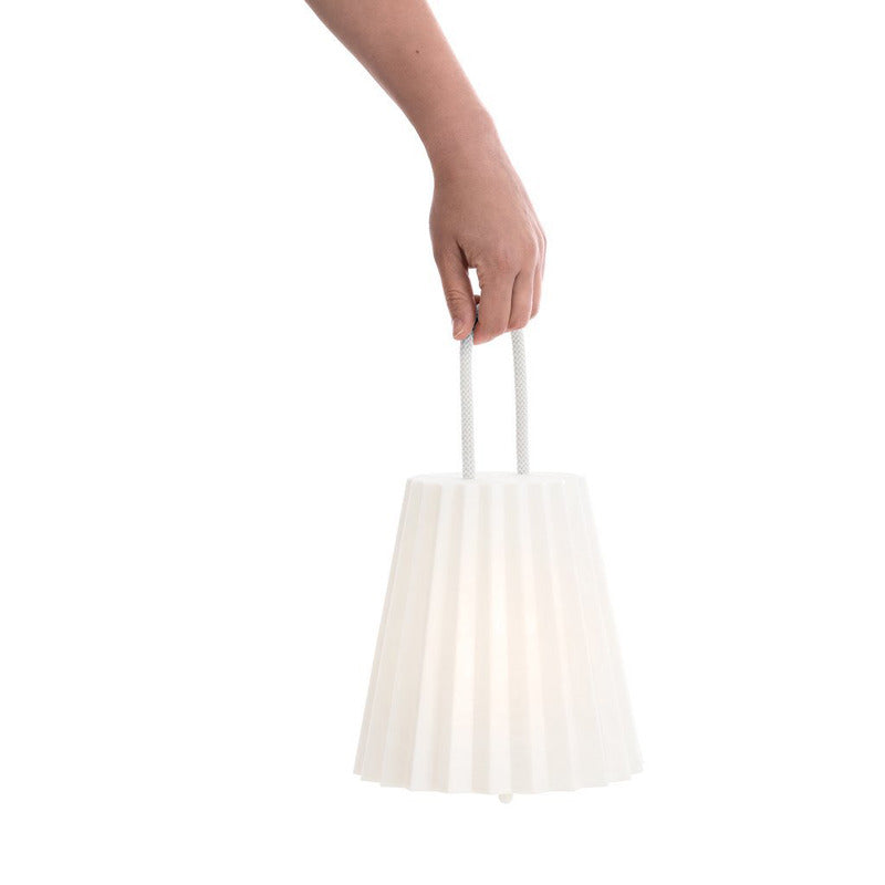 Thanks to its folds made with an unexpected material, polyethylene, and wrist bag-style cord, Plisy is the perfect lighting complement to give a chic and fun touch to an outdoor evening. A portable lamp that translates the aesthetics of elegantly pleated indoor lamp screens into a piece specially designed for outdoor use. Plisy is a stylish and technological reinvention of the garden lantern, which incorporates LED light and is charged by USB.