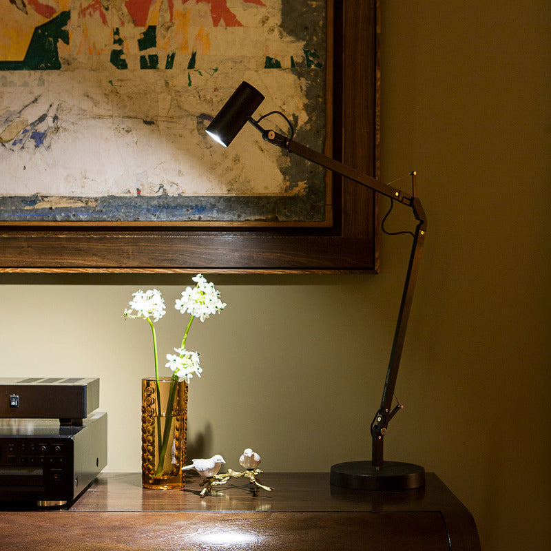 The fluidity of its movements and its total stability make this flexible fitting a light source which can be moved anywhere without cluttering your desk or taking up too much valuable space. Its integrated LED technology allows one to direct the beam with the utmost precision, for a light that is both focused and warm, yet highly useful. The Polo comes with a diffuser made from injected aluminum, arms and built-in swivel joints CNC milled from an aluminum block, and a rotary switch located in the upper part of the head stock. Available in black, it is supplied with a range of accessories: base and more recently a floor stand.