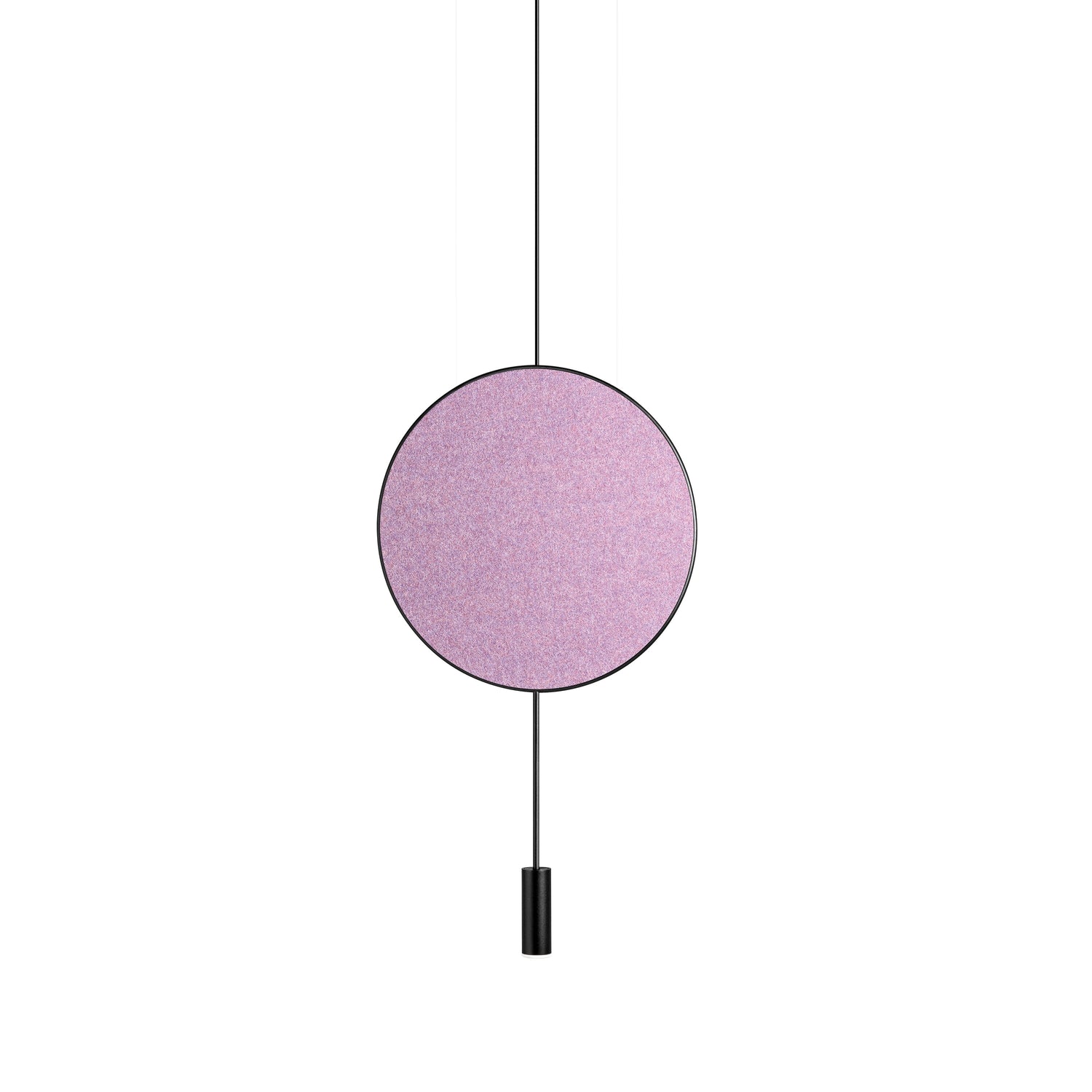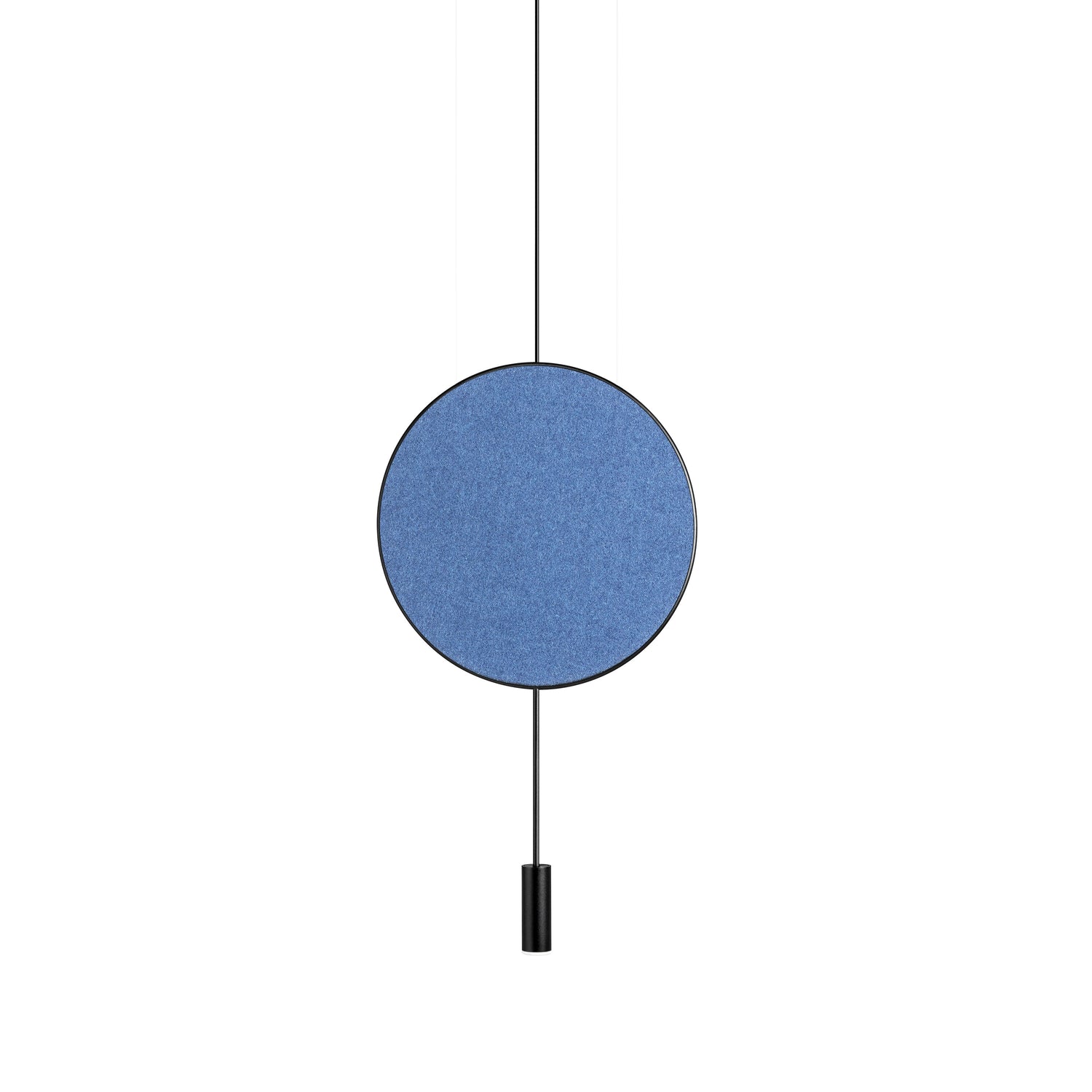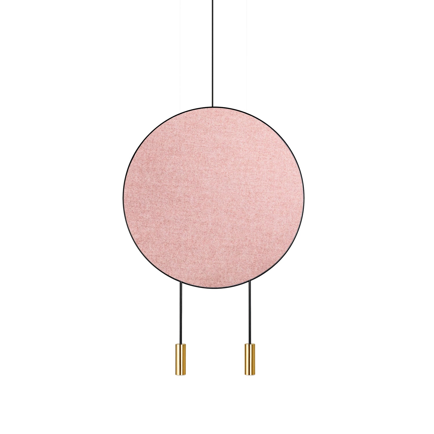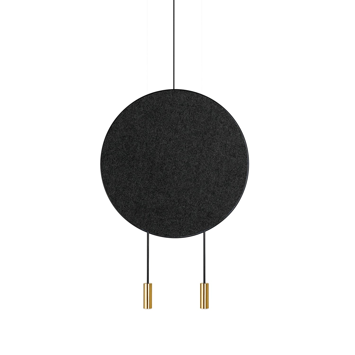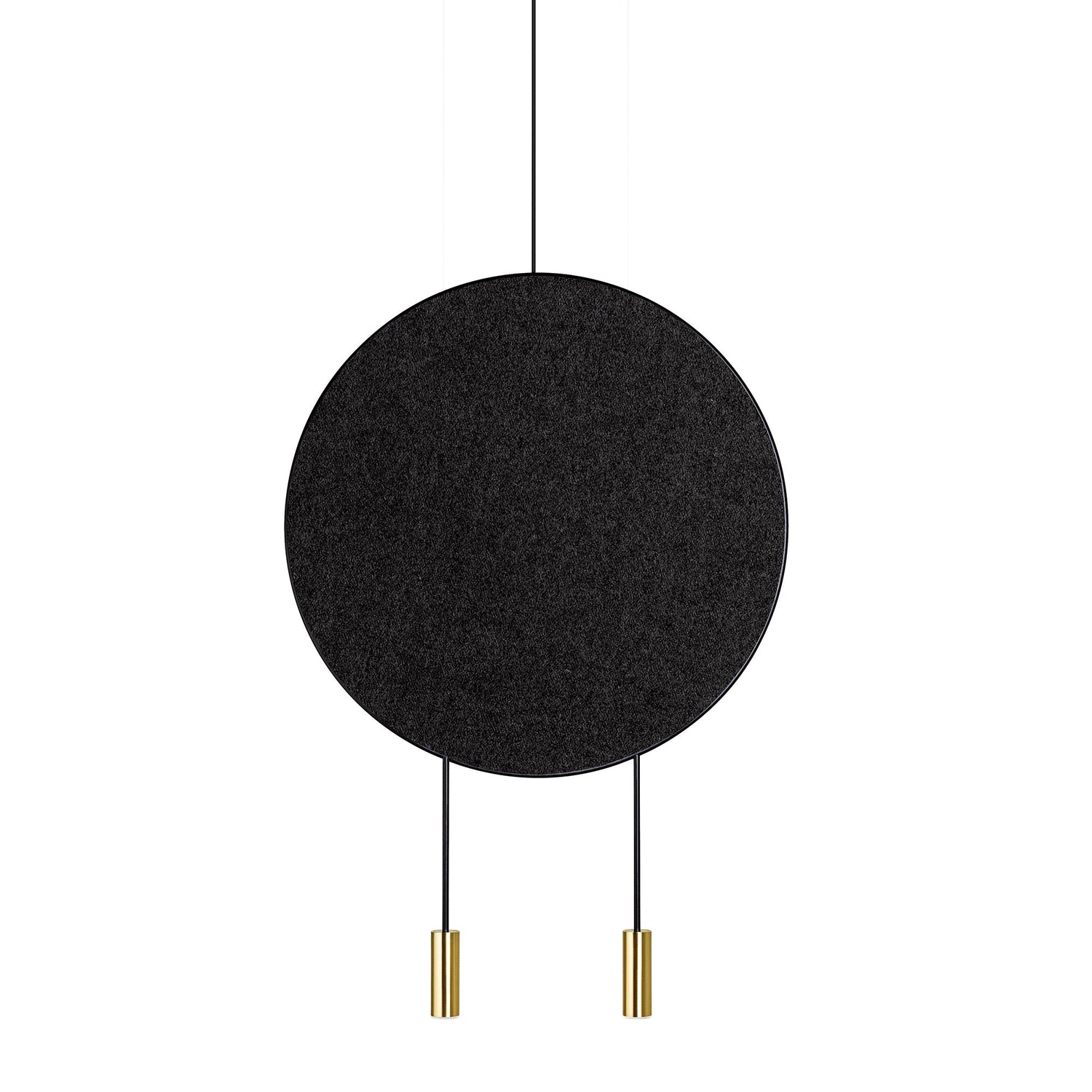 Suspension lamp with a circular body, cylindrical aluminum heads and acrylic (PMMA) lens diffusers. Adjustable height. Optional 50 degrees angle acrylic optic lens conversion kit. Optional decorative sound absorbing panel (¦Á = 0.4) 95% Virgin wool and 5% polyamide.