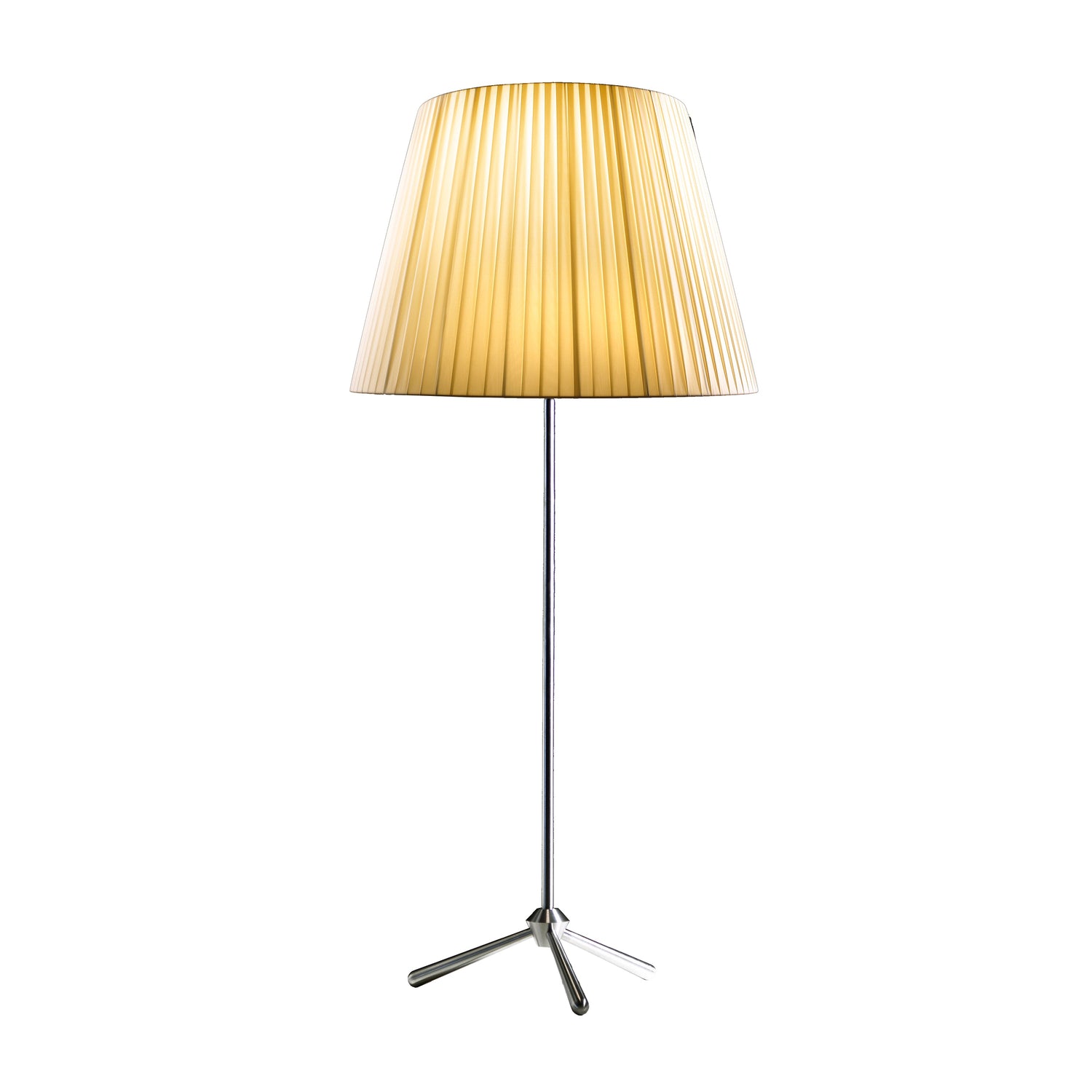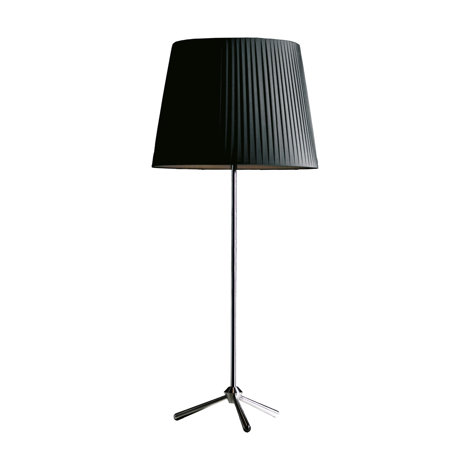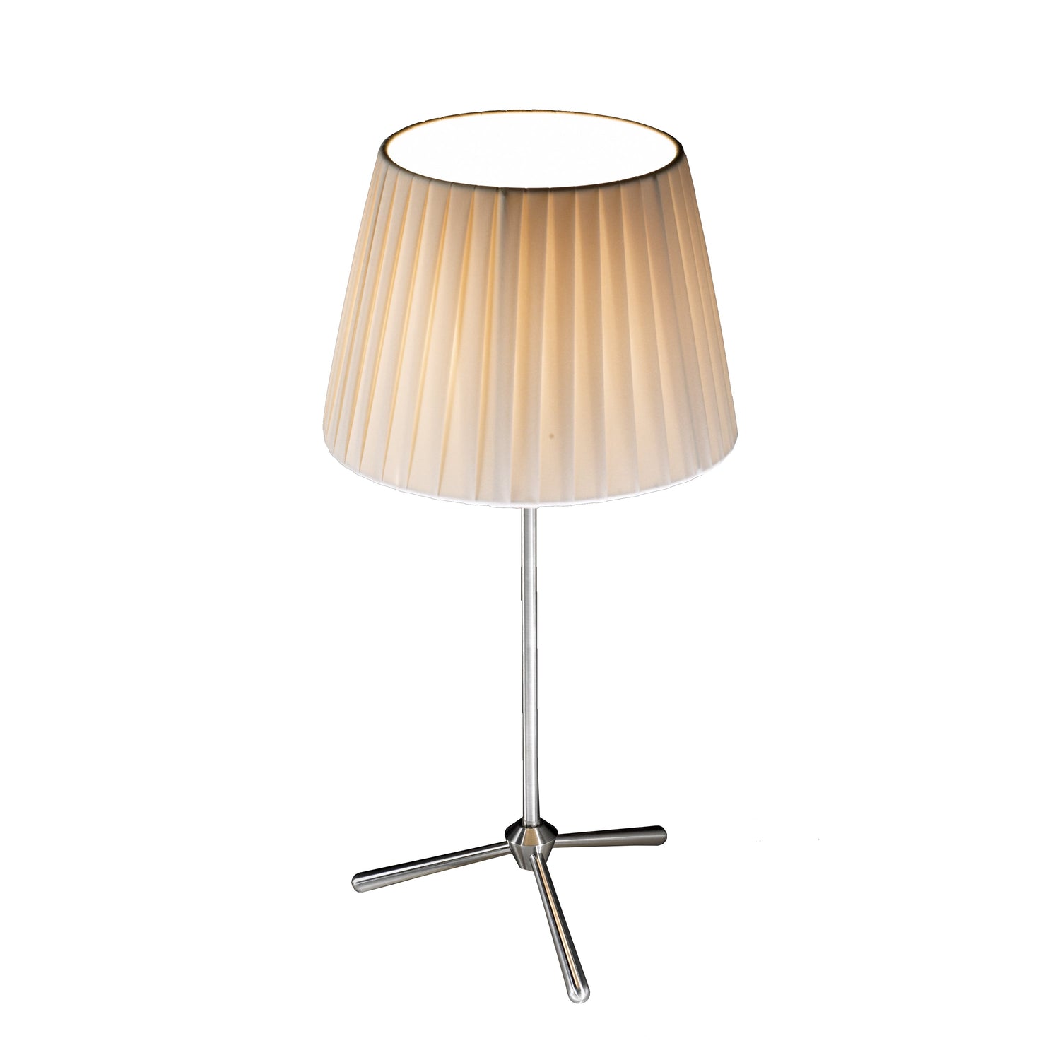 Table lamp with stainless steel tripod base and stem, in a satin finish, with pleated fabric shade. Available in two versions: black shade with a black textile cable, or beige shade with a brown textile cable.