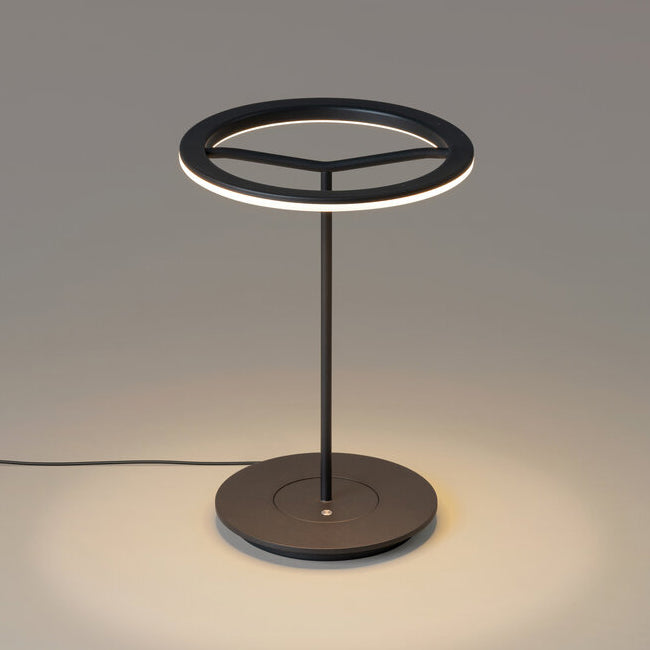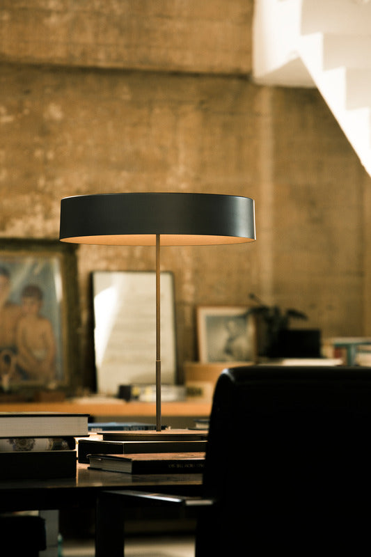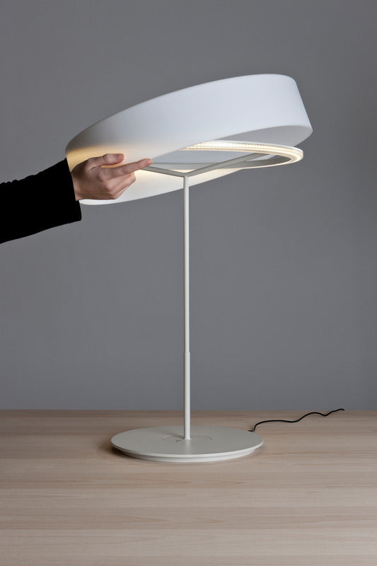 This lamp is named after everything it does without, particularly if it is used without a shade. Commissioned to Antoni Arola in order to transform it into the new basic Santa & Cole lamp in the wake of the LED revolution, it manages to fuse simplicity and technology in order, leaving a luminous ring elegantly hanging in the air. The light can be dimmed using the switch housed in the base, and the larger model on full power can broadly light up any work surface.