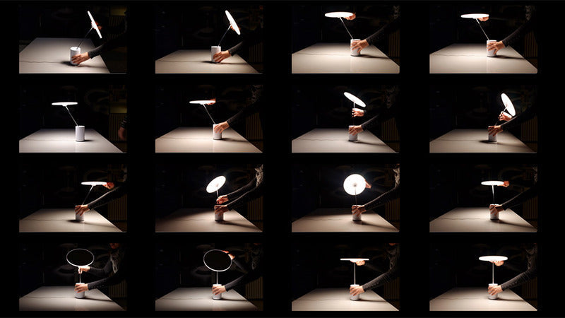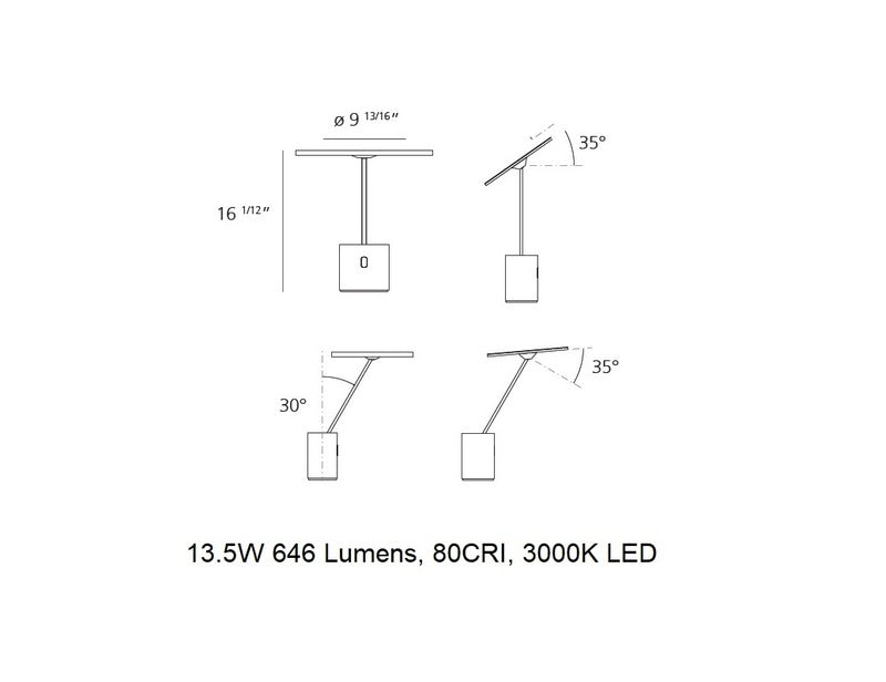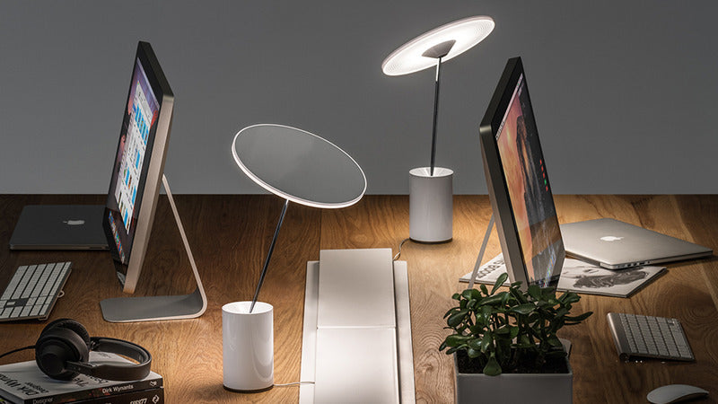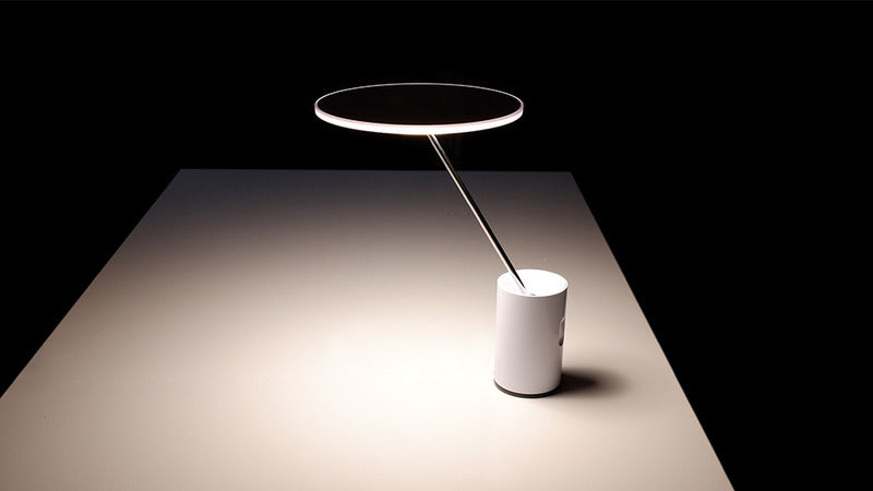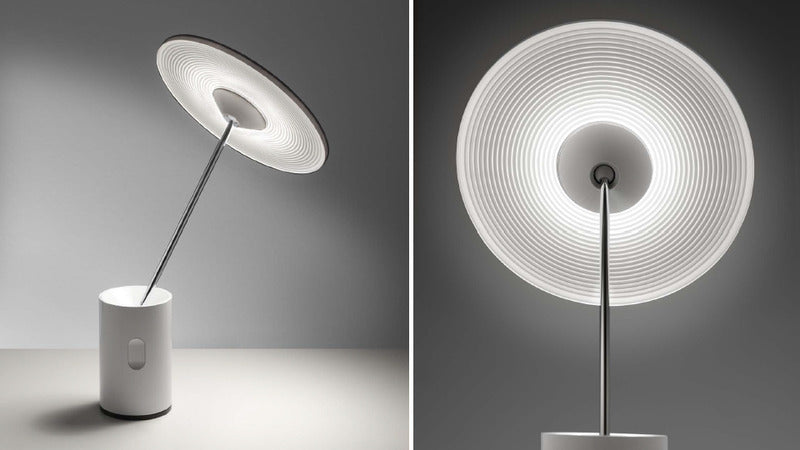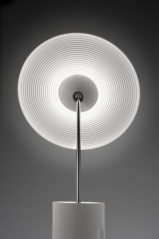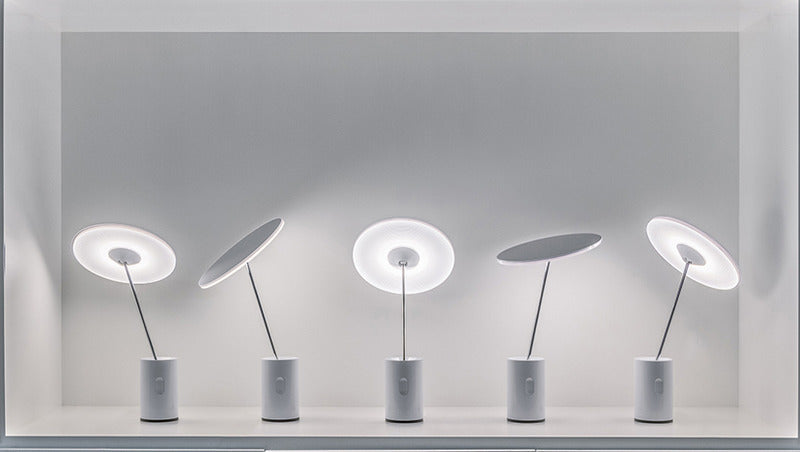 Table lamp combining the needs for visual comfort and ambient lighting. The iconic flat diffuser can be tilted in all directions, providing warm relaxing light for any environment.