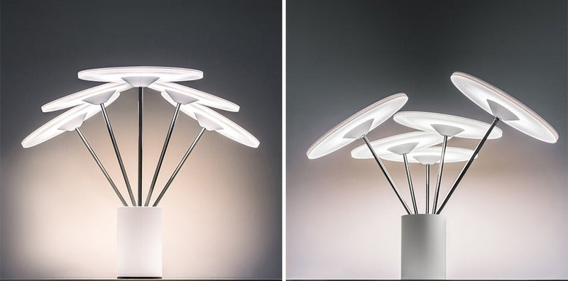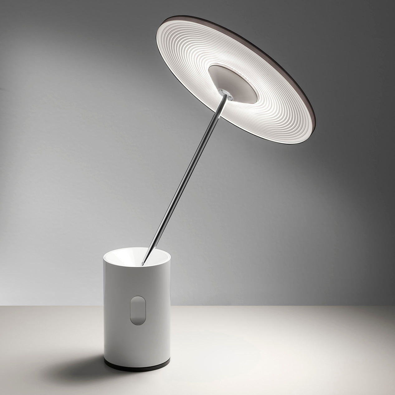 Table lamp combining the needs for visual comfort and ambient lighting. The iconic flat diffuser can be tilted in all directions, providing warm relaxing light for any environment.