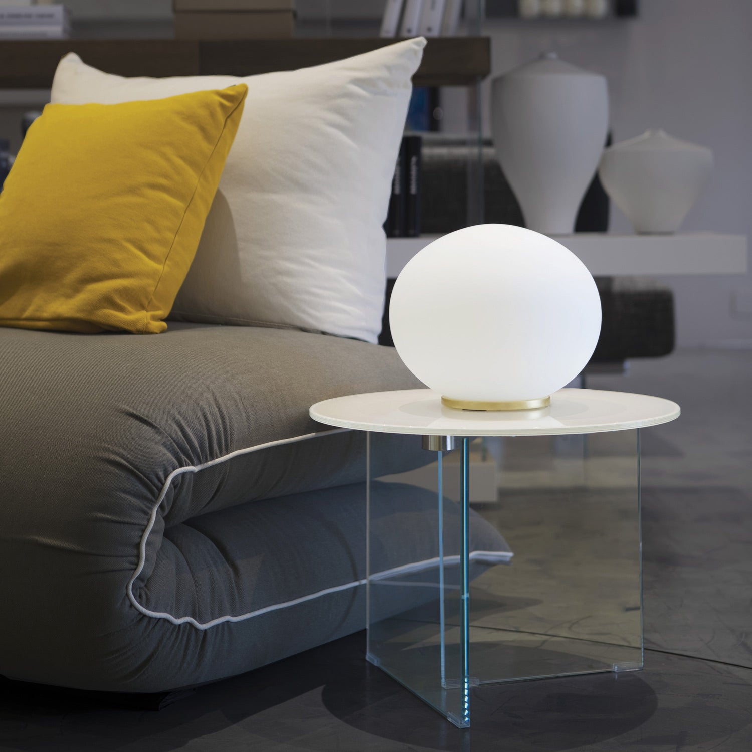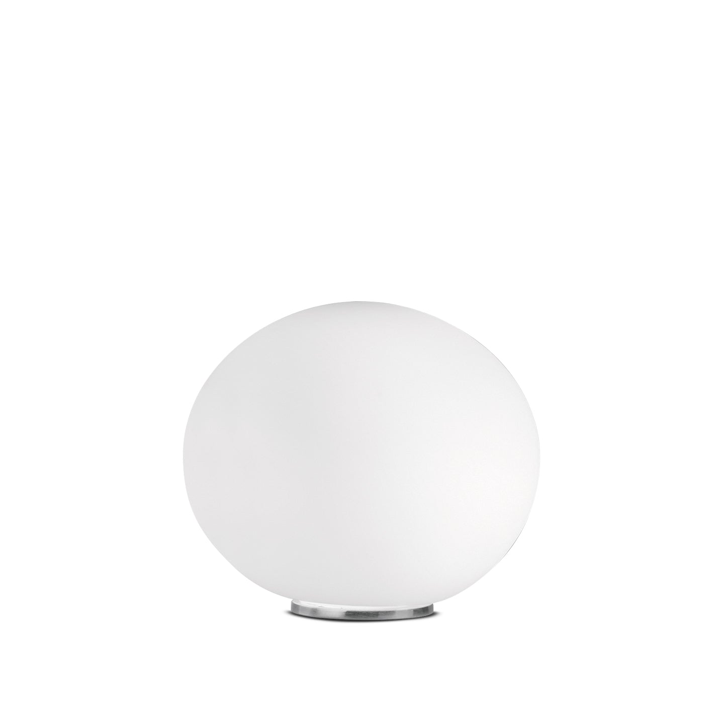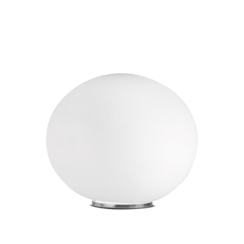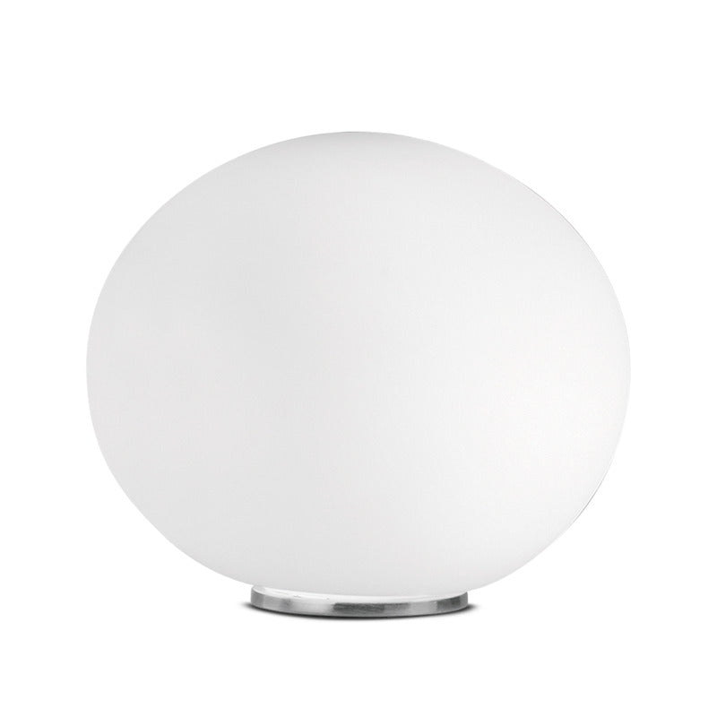 Accent table lamp emphasizes a striking simple design that is highlighted by a hand-blown, satin white glass sphere that sits on a small polished chrome base.