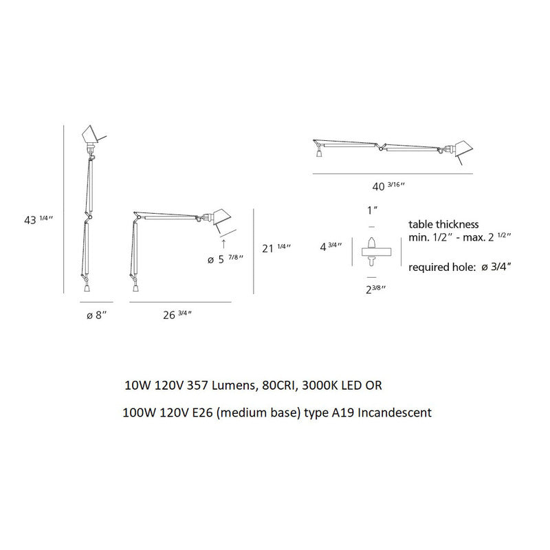 Table standing luminaires for adjustable, direct task, LED, fluorescent, halogen or incandescent lighting.