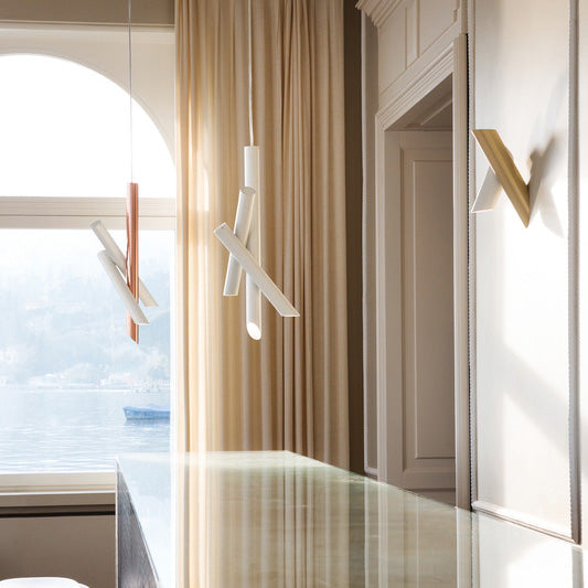 Family of pendant and wall lamps with elements in extruded aluminum. Opal polycarbonate diffusers for warm and ambient lighting. Adjustable elements in the wall versions. Available also with dimmer push on the body of the lamp for the Wall 2 version.