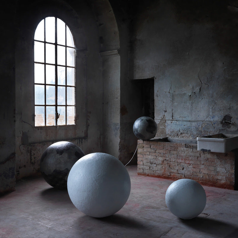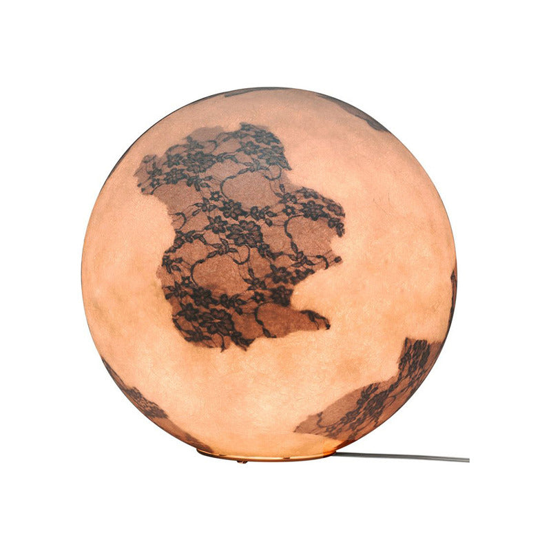 Might we say you'll be over the moon for the Ululi small floor lamp designed by Matteo Ugolini? The fiberglass globe is embedded with lace for a continental serving of textural beauty. These planetary personalities are 17.75 in diameter and there are two color combinations with only subtle differences: the one that appears to have a candlelight glow is painted white and the one that appears a purer white is painted gray¡ªthink of them as the moon's illumination to the earth's shadow.