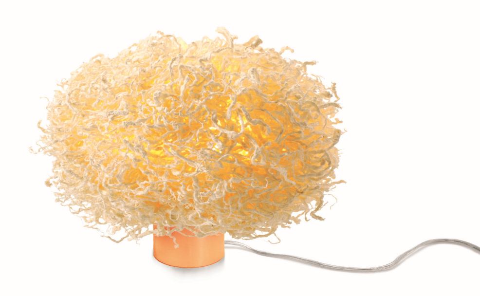 The branches of the mulberry shrubs are harvested in the autumn, and the innermost (white) layer of bark is tripped from the timber and boiled in a mixture of water and soda ash. The strips are then beaten by hand until they have been well separated. The diffuser is formed by hand sewing the prepared clusters of fiber to a cotton grid affixed to the stainless steel base structure. The base of the table lamp is a copper plated cylinder.