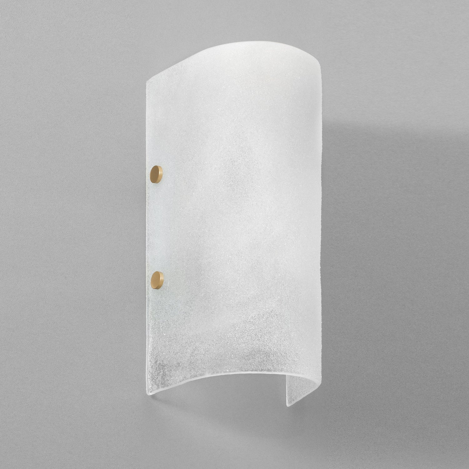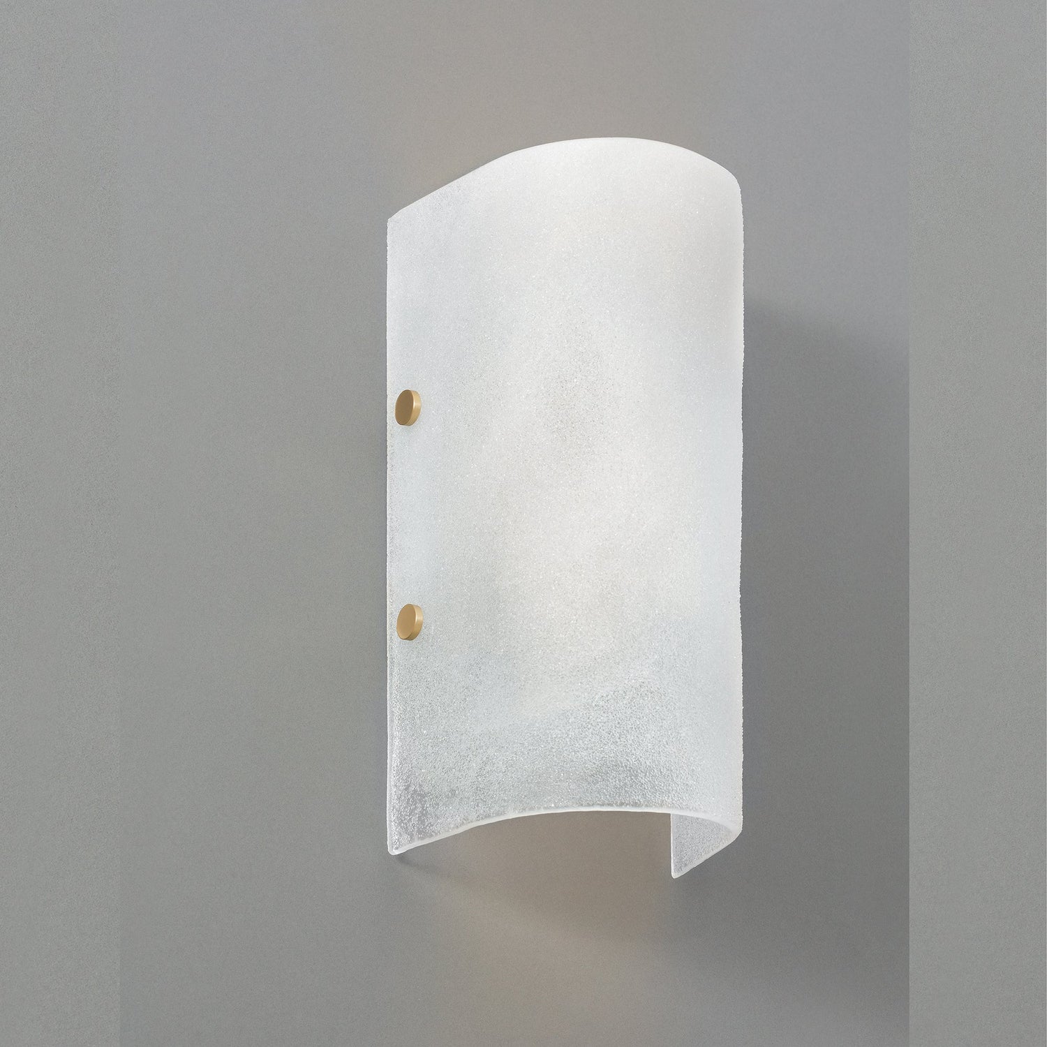 This wall light is made using an exclusive artisan process where crushed glass is formed into a curved shape. Detailed with solid brass finials, the light source is soft and calm.